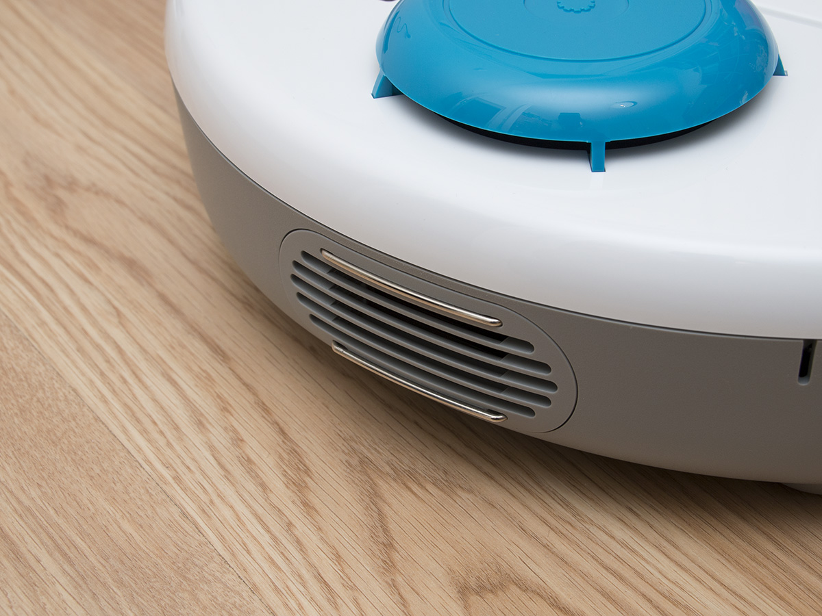 A robot hátulján lévő krómozott csík a töltő érintkezője, amit a dokkolón lévő hasonló csíkhoz nyom hozzá a robot dokkoláskor. A portartályon és szűrőn átszívott levegő az érintkezők közötti rácson távozik a készülékből.