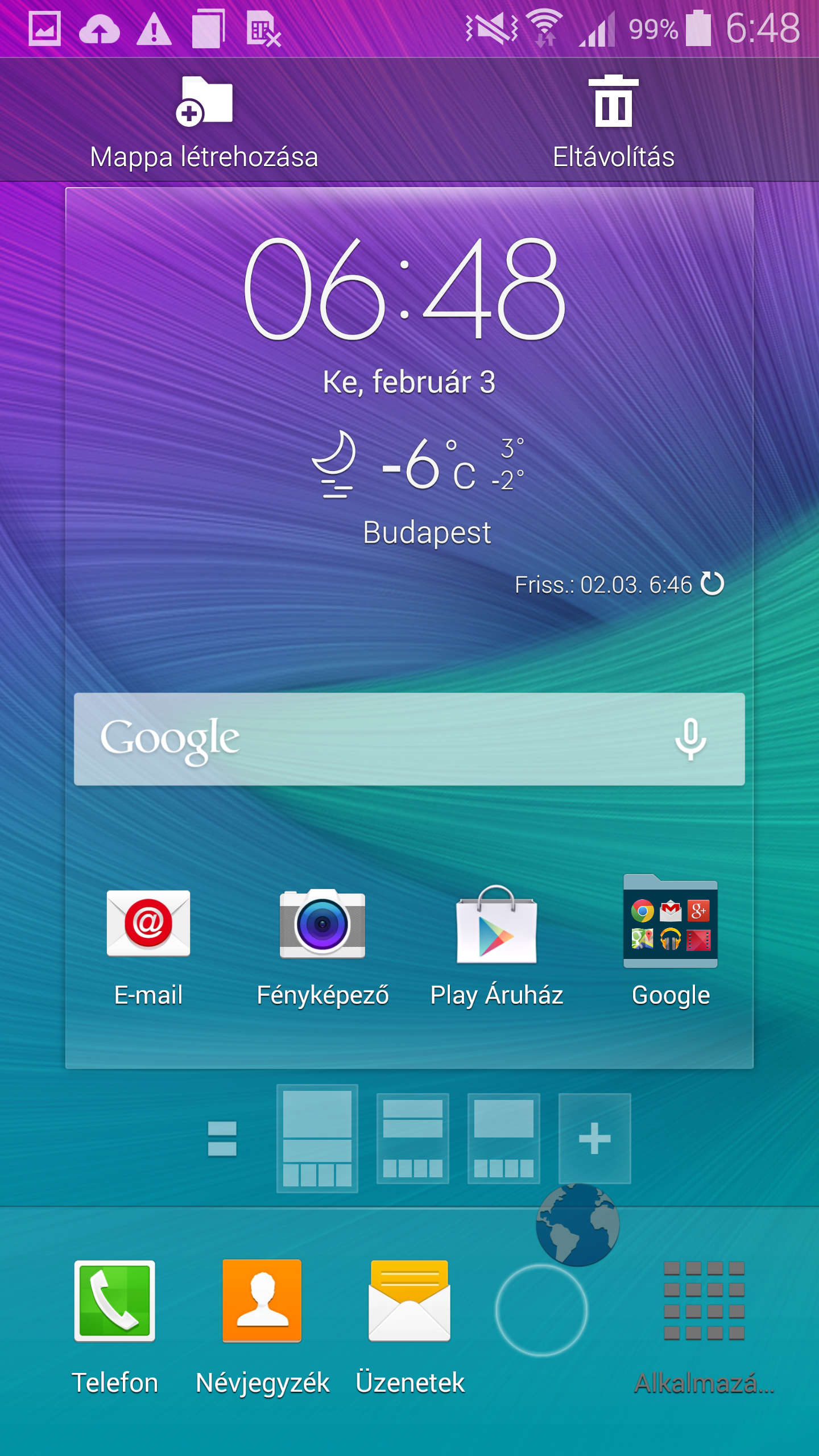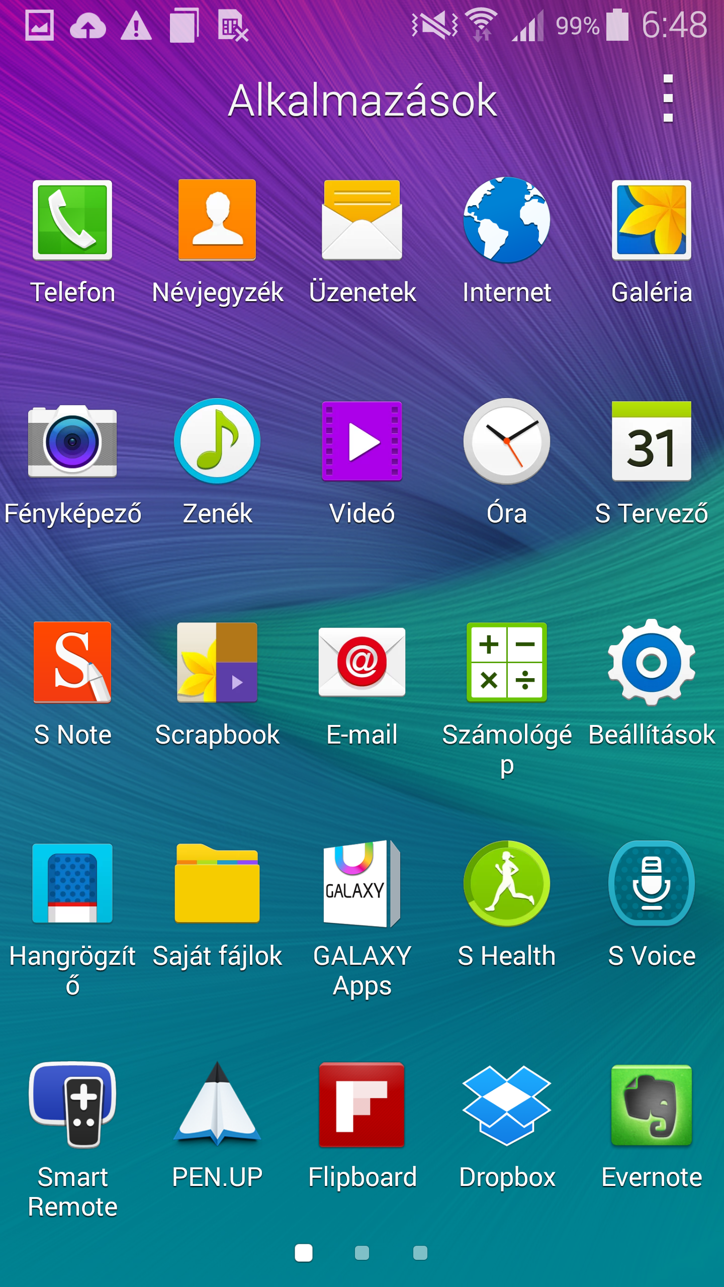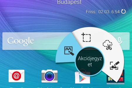 Az S Voice a Samsung személyi asszisztense, amely magyarul sajnos még mindig nem tud. Az infra portot a Smart Remote-tal tudjuk kihasználni: a Note 4-et meglévő eszközeink távirányítására is használhatjuk. A PEN.UP-ról már írtunk, a Flipboard, a Dropbox, az Evernote, a Facebook, a Messneger, a WhatsApp és az Instagram pedig régi ismerősök, mindenki tudja, hogy mire valók. A programválasztó második oldalára a Google szoftverek kerültek (Chrome, Gmail, Google+, Térkép, Play Zene, Play-filmek, Play Könyvek, Play Újságos, Play Játékok, Drive, YouTube, Fotók, Hangouts, Hangalapú keresés), ezekhez szintén nem szükséges bővebb magyarázatot fűzni.