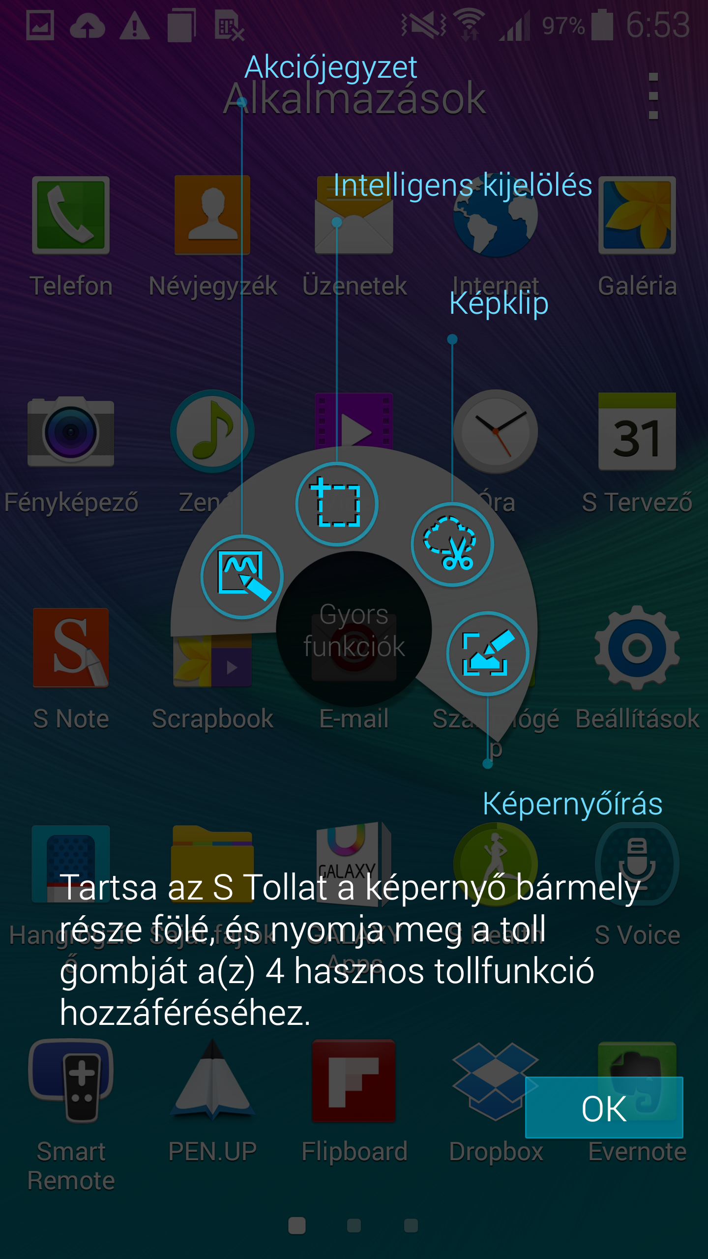 Okos megoldás, hogy a tollat a helyéről kivéve szintén felugrik a gyorsmenü, amivel rögtön készíthetünk jegyzeteket, hogy aztán a felhőbe szinkronizáljuk vagy akár megosszuk őket vagy esetleg további információkat keressünk róluk a neten.