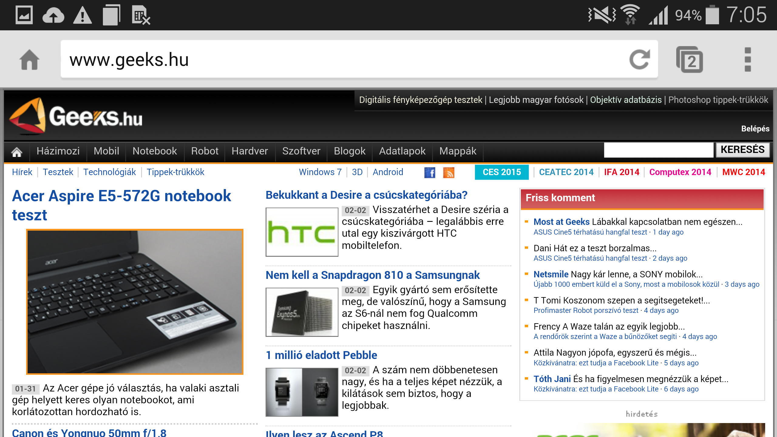 A kijelző felbontásából adódóan a weboldalak állított helyzetben is elférnek, de persze a kis betűméret miatt nehezen olvashatók. Ezen az újratördelés segíthet, és ezt az opciót az Internet app fel is ajánlja. A böngésző(k) sebességével értelemszerűen nincsen gond, netezésre az egyik legjobb androidos készülék (a telefonok között) vitathatatlanul a Note 4.