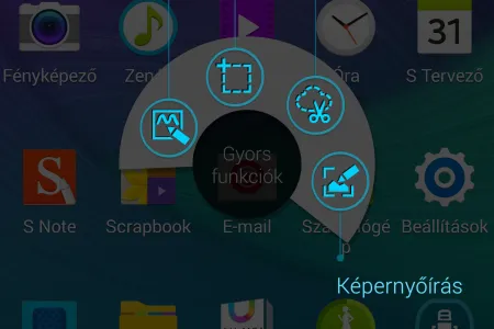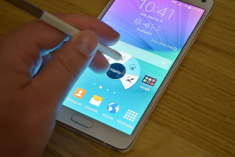 Az egyik az, hogy nyomásérzékeny, a Galaxy Note 4 ráadásul 2048 szintet képes megkülönböztetni. A másik dolog pedig az, hogy nemcsak akkor működik, ha a hegyét hozzáérintjük a phablethez, az is elég, ha közel visszük hozzá. Ilyenkor a kijelzőn apró karika jelöli a kurzort, az S Penen lévő gombot megnyomva pedig előhívhatjuk a helyi menüt, amivel rögtön kezdhetjük is a kreatív munkát: jegyzetet készíthetünk, akár képernyőmentéssel egybekötve is, fotóknál szerkesztési módba léphetünk, stb. Ez a fícsör egyébként AirView névre hallgat.
