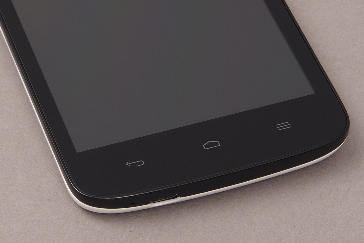 A megcélzott vásárlói réteget figyelembe véve a dizájn teljesen átlagosnak mondható, a telefon elöl fényes fekete üvegburkolatot, hátul fehér, műanyagból készült borítást kapott. Elöl az 5 colos kijelző terpeszkedik, amelynek elhelyezkedése nem szimmetrikus, a telefon felső részéhez kissé közelebb helyezkedik el. Talán ennek is köszönhető, hogy a márkanév lemaradt, és a panel felett csak a beszédhangszóró, az előlapi kamera és a fényérzékelők számára jutott hely. A kijelző alatti nagyobb hely három érintős gombot tartalmaz, amelyek funkciója (balról jobbra haladva) vissza, Home és menü. Hogy egy kicsit előre szaladjuk, a kiosztás nem a legszerencsésebb, mivel a telefonon az Android 4.4-es változata fut, amelyhez a feladatkezelőt előhívó gomb jobban passzolt volna – de ez persze valamennyire ízlés dolga is. Azért a feladatkezelőt is elő lehet csalogatni: ehhez a menü gombot kell lenyomva tartani kb. 1 másodpercig.