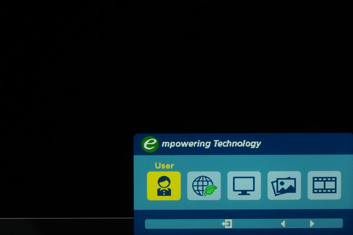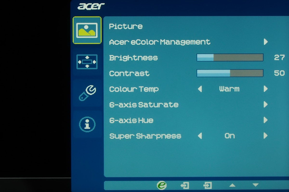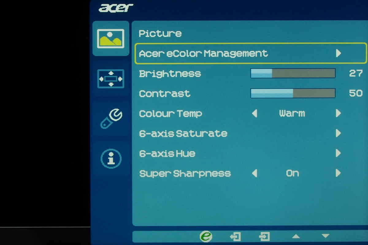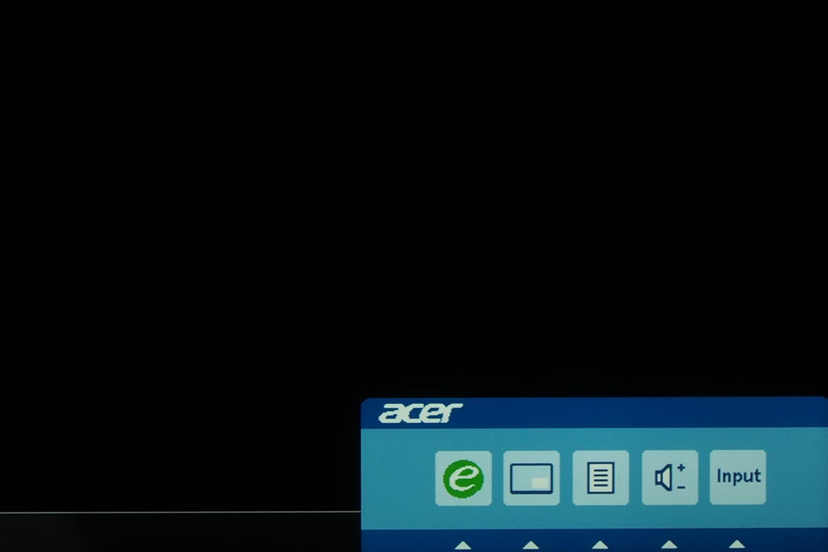 A monitor a szokásos Acer menüvel rendelkezik, és mivel egy átlagos felhasználóknak készült termékről van szó, ezúttal különlegesebb opciókat sem találunk. A vezérléshez hardveres gombokat használhatunk, és noha az Acer menüinek kezelését egy kicsit talán szokni kell, a kezelés összességében nem bonyolult. A menü egyébként a gombok feletti területen jelenik meg, és mindig mutatja az is, hogy az egyes kezelőkkel milyen funkció érhető el éppen.