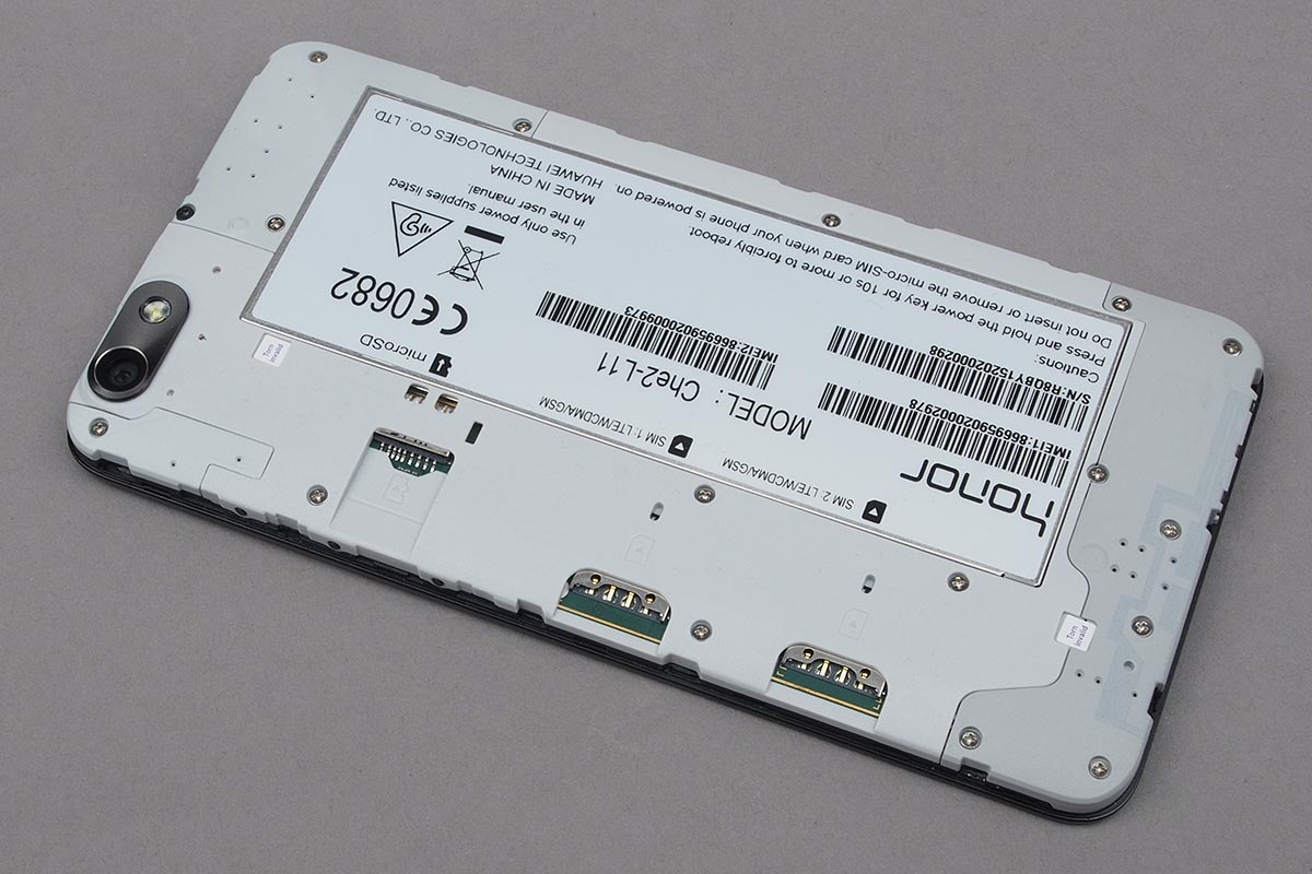 Az akku oly annyira nem elsődleges, hogy még csak másodlagosnak sem mondhatjuk, mivel nem is látszik; a telep nem is cserélhető házilag. A telefon bal oldala üres, a két fő gomb a jobb oldalra, annak is a felső részére került. Fent és lent egy-egy mikrofon dolgozik, amelyet fent a fülhallgató kimenete, lent pedig a microUSB valamint a külső hangszóró nyílása egészít ki. A hátlap csak a fényképező és a hozzá tartozó LED-es villanót rejti, illetve itt azért már olvasható egy Honor felirat.