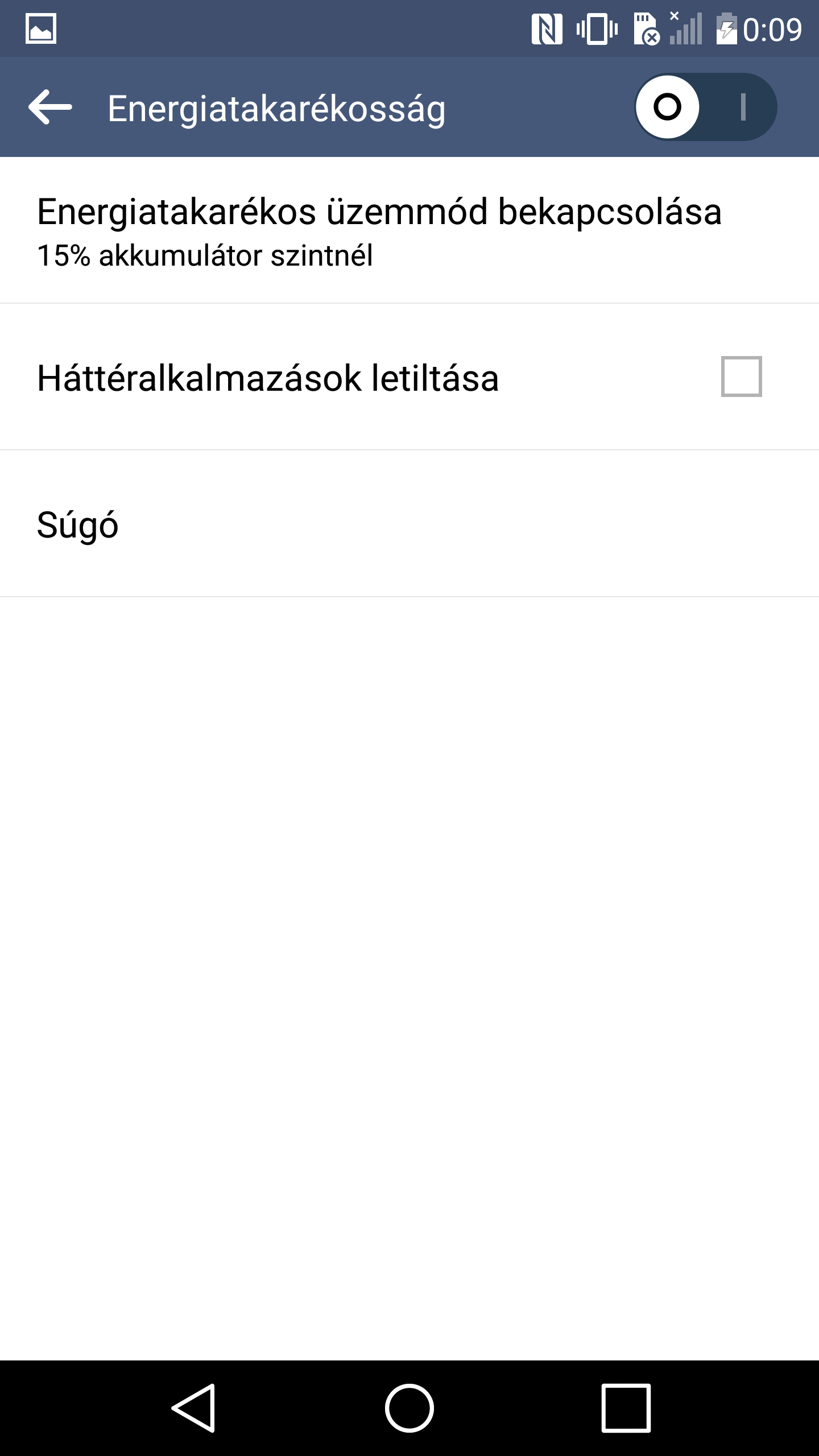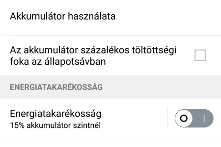 A menüben van néhány energiagazdálkodási funkció, de ez nem annyira szabadon paraméterezhető, mint a konkurenseknél. Bekapcsolásával a kétnapos használat mégis elérhető, de cserébe a telefon az internet hozzáférést igénylő programokat a háttérben korlátozza, így azok adatai nem frissülnek.