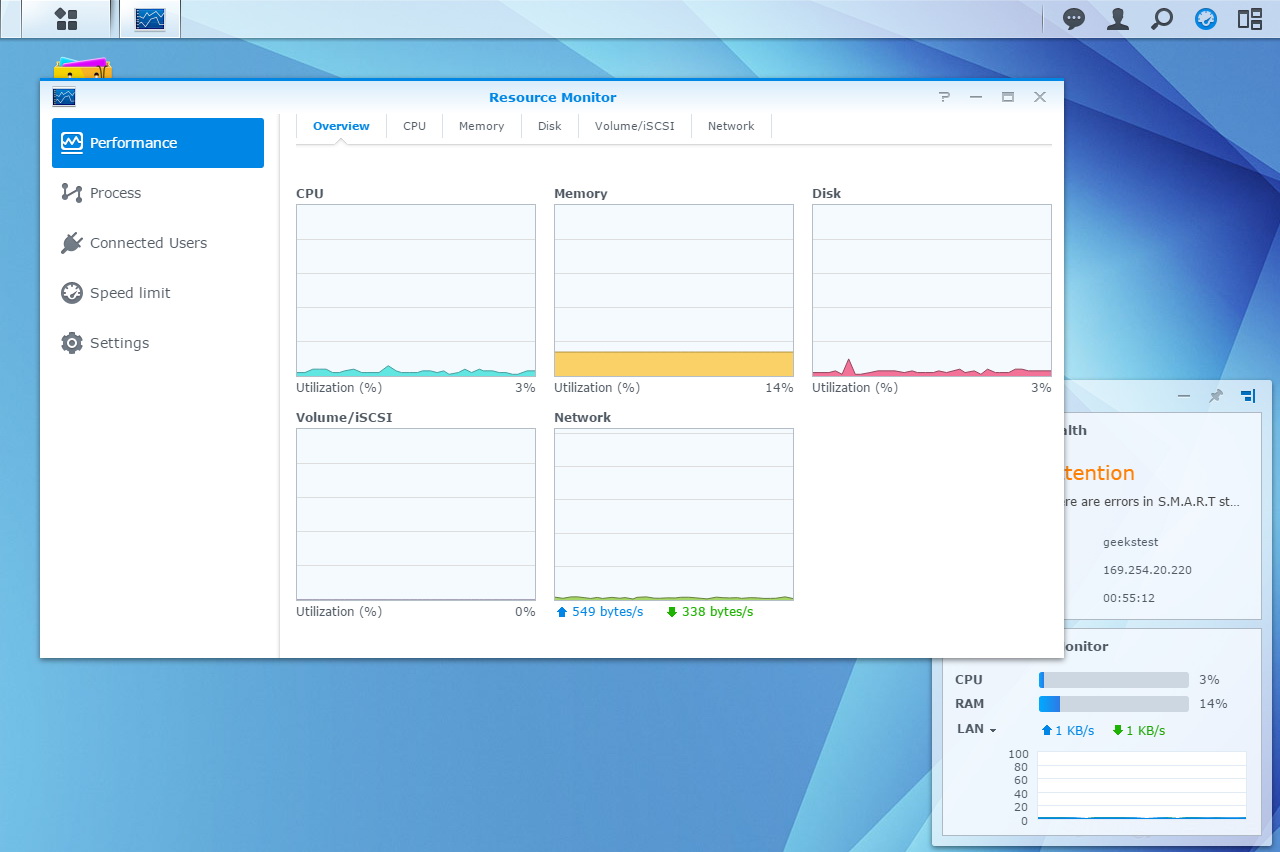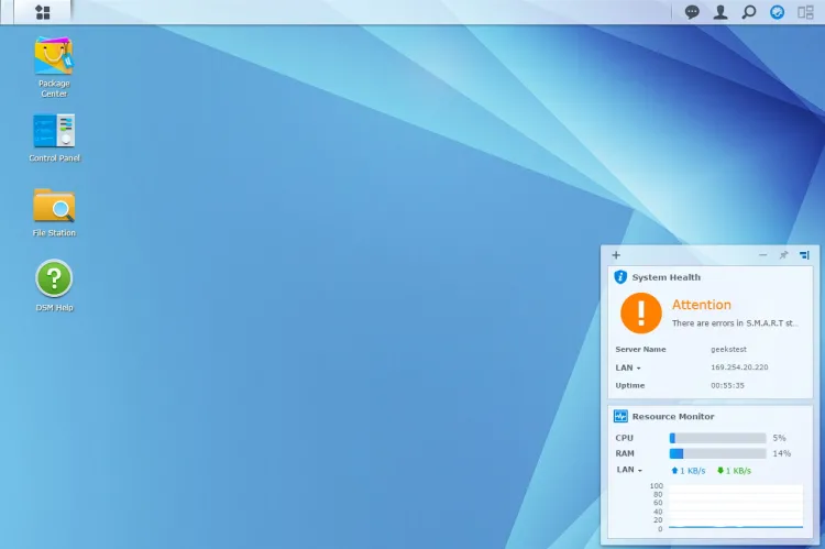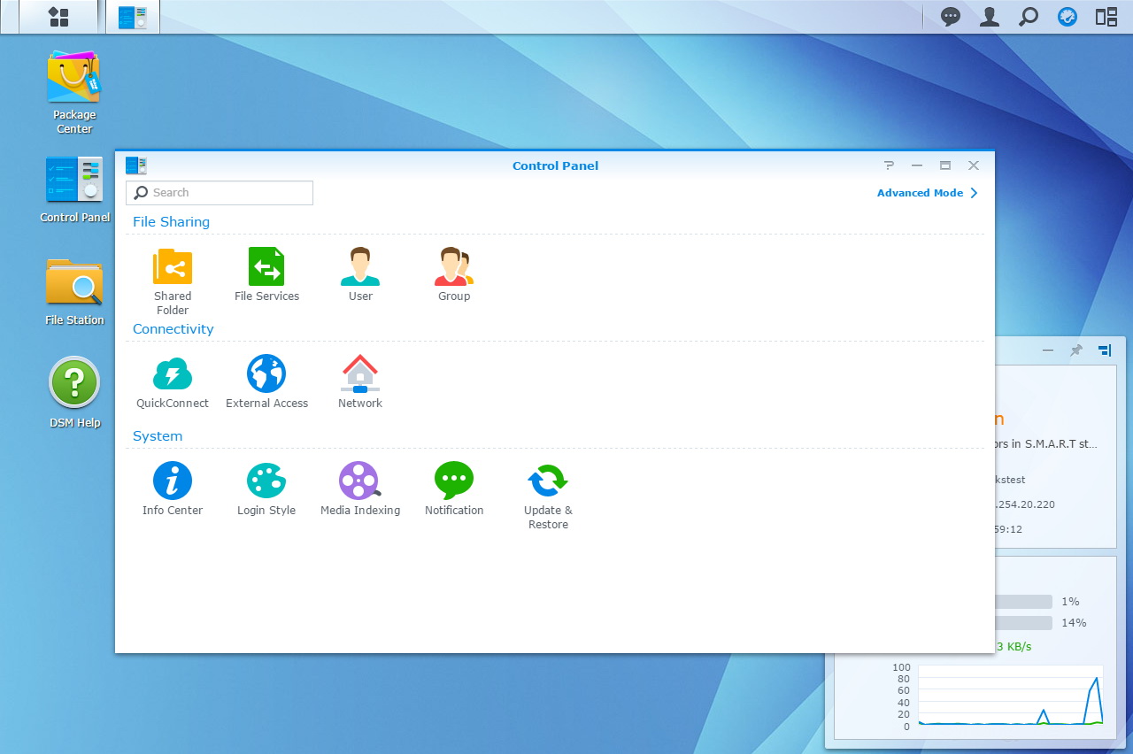 A Synology DS216play kezelőfelületét a Synology Assistant segítségével vagy a NAS IP-címének segítségével érhetjük el. Aki ismeri a DSM-et, annak természetesen sok újdonsággal a felépítést illetően nem tudunk szolgálni, de az újak kedvéért röviden elmondjuk, hogy a DSM külső jegyei alapján is úgy néz ki, mint egy operációs rendszer: futtatható alkalmazásokkal, rendszermonitorral, egymás mellett ablakban megjelenő szolgáltatásokkal. Nagyon könnyű eligazodni benne, akár Windowshoz akár Linuxhoz szokott valaki. A beállítási lehetőségek tárháza széles, sok apróságot lehet beállítani – többek között azt is, hogy a merevlemezek mennyi készenléti idő után tartsanak pihenőt. A DSM természetesen saját tűzfallal is rendelkezik, és hasznos funkció benne, hogy a fontosabb értesítéseket, riasztásokat SMS-ben vagy Skype-on is el tudja küldeni.