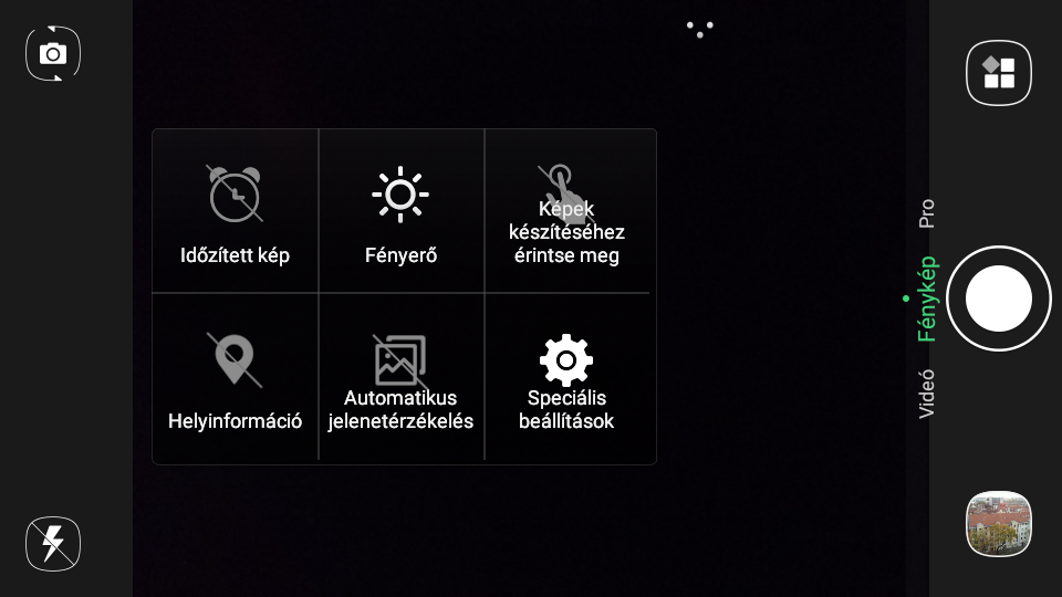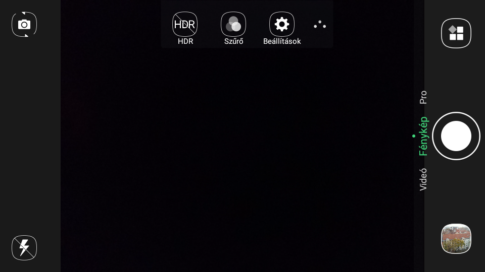 Manuális beállítások: EV (+/-2), fehéregyensúly, ISO, fókusz + rács, időzítő, vaku, HDR