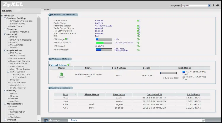 A Zyxel NAS520-at alacsonyabb órajelű rendszerchip hajtja meg, mint az NSA325-öt, viszont nem ARM, hanem Freescale chipről van szó, amely ráadásul kétszer annyi, 1 GB memóriát kapott, így a vas teljesítménye bőven elegendő. Van még egy 256 MB-os belső tárhely is, amire a rendszer kúszik fel, de mivel ez a terület semmi másra nem jó, ennek a dolognak igazából nincsen jelentősége. Hacsak nem annyi, hogy például a Synology megoldásával szemben, amikor is az OS a merevlemezekre kerül, előnyt jelent, hogy a NAS rögtön, az operációs rendszerének telepítése nélkül használatba vehető. A hálózati adaptereket Realtek RTL8211E vezérli, a három USB csatlakozó pedig egy Asmedia ASM1061-es chipre csatlakozik. Amit fontos és érdemes elmondani még, az az, hogy a meghajtókat akár a NAS kikapcsolása nélkül is cserélhetjük, amiből mondjuk csak RAID-1 mód használatakor profitálhatunk, ilyenkor viszont nagyon jól jön, hogy a meghibásodott merevlemez helyett minden különösebb hercehurca nélkül tehetünk be másikat. Kiemelendő, hogy bár a visszajelző LED a csere után azonnal OK állapotot jelez, a második merevlemezre az adatok leszinkronizálását kézzel kell elindítani.