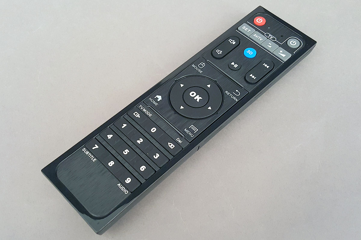 A távirányító egyébként egy teljesen egyszerű darab, annyi extrával, hogy nemcsak a boxot, hanem a tévét is irányíthatjuk vele (kikapcs/bekapcs, bemenet, hangerő). A gomboknak háttérvilágítása nincsen, a Home és a Menü funkciók viszont közvetlenül is elérhetők.