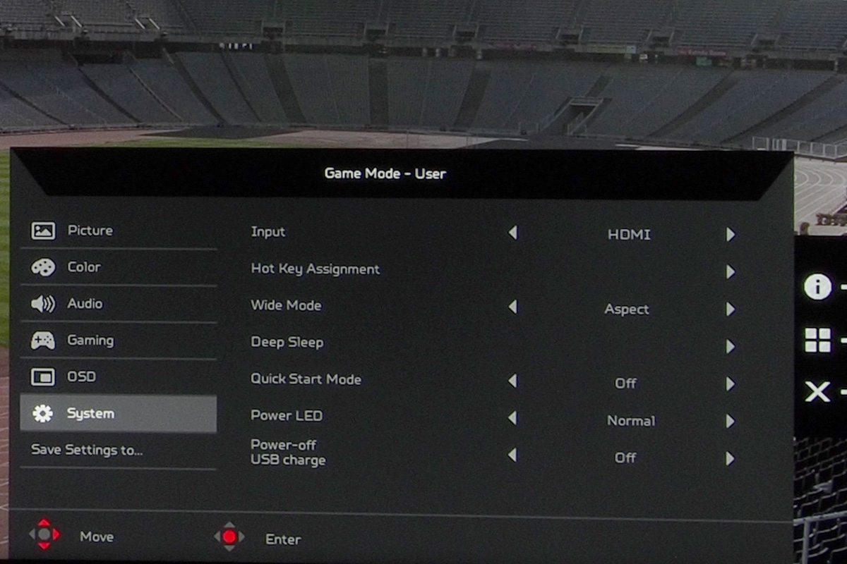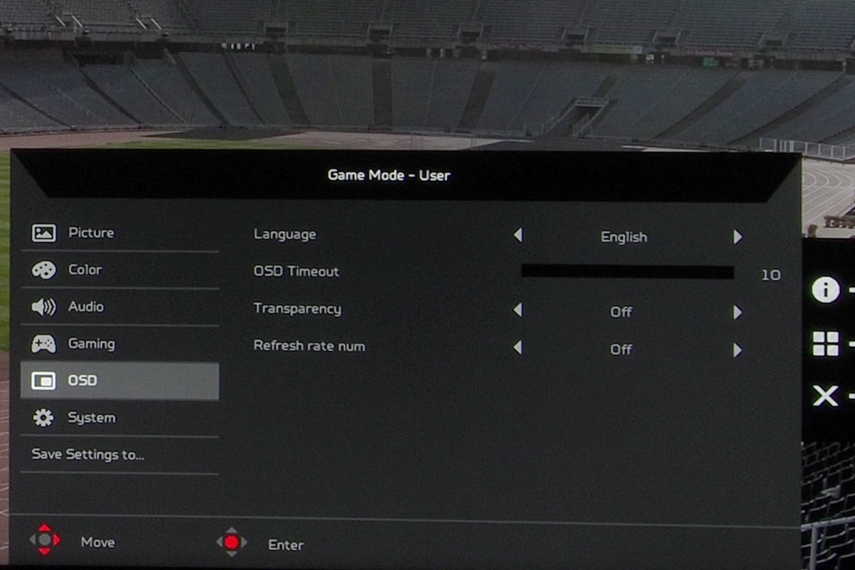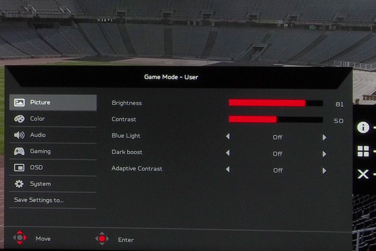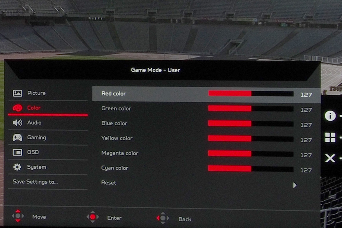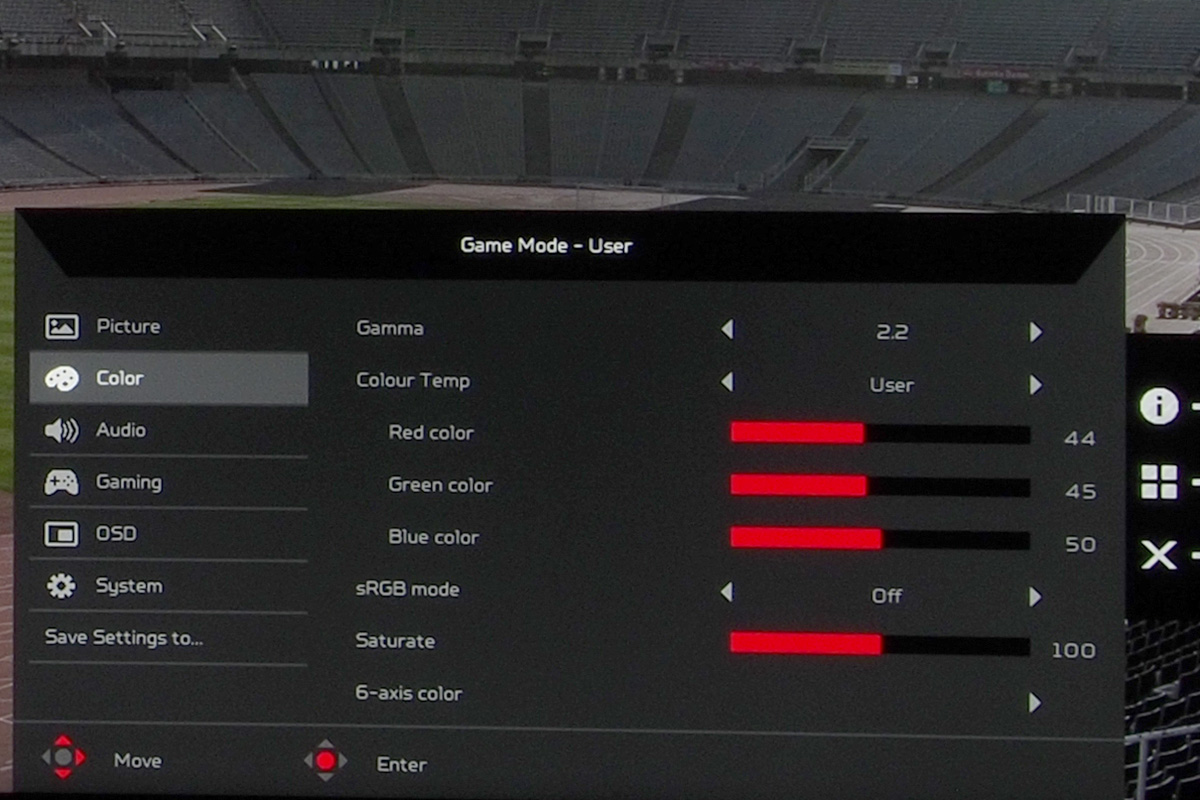A menü összetett (de átlátható), ami annak köszönhető, hogy az Acer minden lehetséges opciót beépített, így nemcsak az alapszintű képkezelési beállításokat találjuk meg, hanem módosíthatjuk a gammát és a színteret, van hattengelyes színkezelő rendszer és még a kék fény intenzitása és négy lépésben csökkenthető, ha mondjuk olvasni szeretnénk.