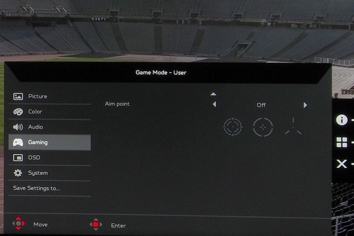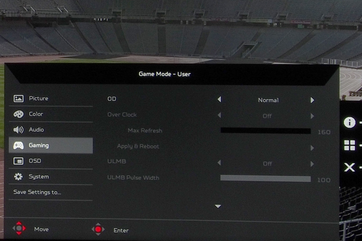 A játékokhoz kapcsolódó beállítások sem kevésbé érdekesek, itt lehet a 144 Hz-es képfrissítést 200 Hz-re növelni, de bekapcsolhatjuk az elmosódás csökkentésére szolgáló ULMB opciót illetve aktiválhatjuk a célkeresztet is, ha nem lenne ilyen opció abban a játékban, amit éppen játsszunk.