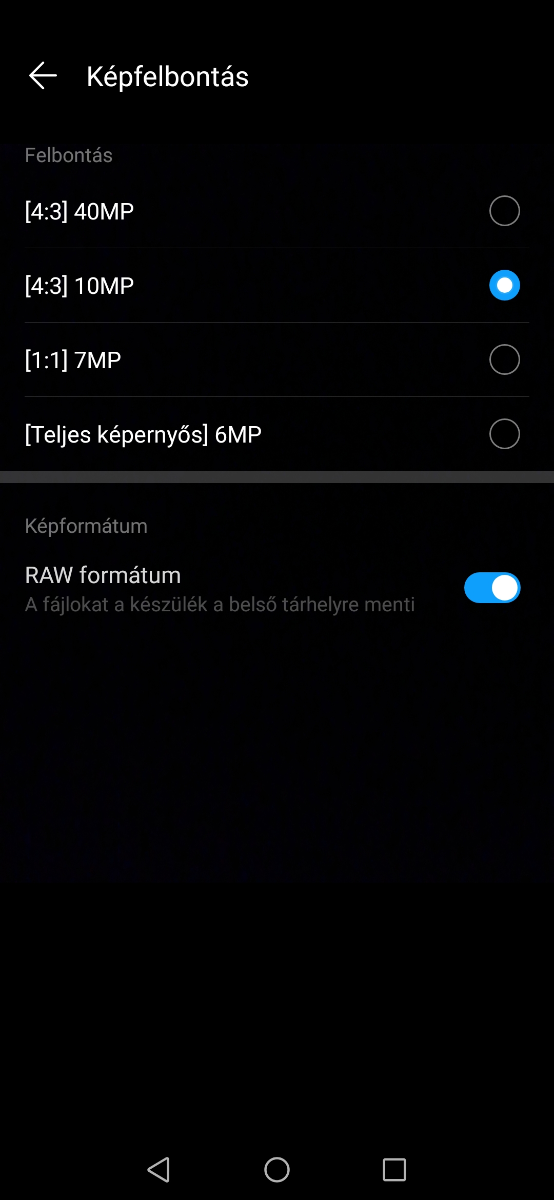 Kezdjük azzal, hogy a 40 MP-es szenzorral 4:3-as felbontás mellett 40 és 10 MP-es fotókat is készíthetünk. Ha 40 MP-es felbontást állítunk be, akkor alapesetben 40 MP-es képeket készíthetünk, de csak és kizárólag az elsődleges objektívet dolgoztathatjuk. Egy kis trükkel visszakaphatjuk a zoom és nagylátószögű objektívet is viszont: engedélyeznünk kell a RAW módot. Ebben az esetben nagyítás továbbra sincs, csak 1×-es, 0,6×-os illetve 5×-ös értékek közül választhatunk, és (rendre) 7280×5456 pixeles (40 MP), 5104×3824 pixeles (20MP) illetve 3248×2432 pixeles (8 MP) fotó lesz az eredmény. A telefon természetesen a RAW fájl mellett készít JPG-t is, igaz valamivel gyengébb minőségűt, mintha csak JPG-t kérünk.