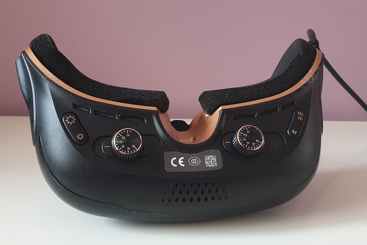 A headset alsó részére balra és jobbra is került egy-egy gomb, előbbivel a fényerő állítható, utóbbi pedig a 2D és 3D üzemmódok közötti váltásra szolgál. A HDMI kábelt jobb oldalra építették be; sajnos a kábel fixen hátrafelé néz, így elképzelhető, hogy a nagyobb fülkagylóval rendelkező fejhallgatókkal összeakad. A bal oldalon ugyanilyen irányban egy analóg jack csatlakozó várja a fül- és fejhallgatókat. Nem látszik, de nagyon fontos tulajdonsága a Cinegónak, hogy hattengelyes giroszenzort és gyorsulásmérőt is kapott; ezeknek az adatait egy androidos okostelefon 360 fokos panorámaképek nézegetése közben vagy játékok vezérlésénél illetve VR üzemmódban tudja felhasználni. A headsethez természetesen jár fejpánt is, amivel stabil és kényelmes a rögzítés.