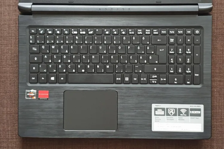 Az Acer Aspire 3 AMD-s változata is igényes billentyűzettel érkezik, amely szigetes (chiclet) kialakítású gombokat használ. A nagy méret a klaviatúra esetén sokszor még jól is jön, mivel a gombok számára is több a hely. A leütési úton ez mondjuk nem látszik, de a gépelési élménnyel nincs gond, mert a keménység megfelelő és a nyomáspont is kellően határozott. Az olcsóbb gépekre jellemző módon ugyanakkor a billentyűzet egész felületet középen benyomható kissé. Háttérvilágítás nincs – persze örülnénk, ha lenne, de ebben az árkategóriában azért ez nem lenne reális elvárás.