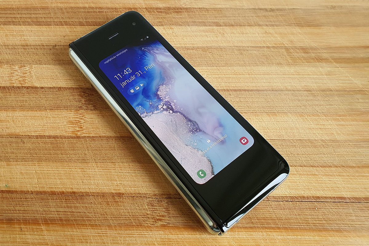 Szétnyitva a telefont, a 7,3 colos gigantikus, de furcsa képarányú kijelző uralja a terepet, amelynek egyedül a jobb felső sarkából csíptek le kicsit szenzorsziget címén. Itt két kamera plusz néhány szenzor lapul. A szétnyitáshoz és az összecsukáshoz nagy erő nem kell, viszont a telefon biztos, hogy magától nem fog kinyílni, mert csukott állapotban mágnes tartja össze. A hátlap sem üres természetesen, itt a Galaxy S10+-ról átköltöztetett kamerarendszer találjuk, amely ennél a mobilnál is kilóg. És mivel a kamera sziget a sarokban van, ha letesszük a mobilt az asztalra, akkor bizony billegni fog.