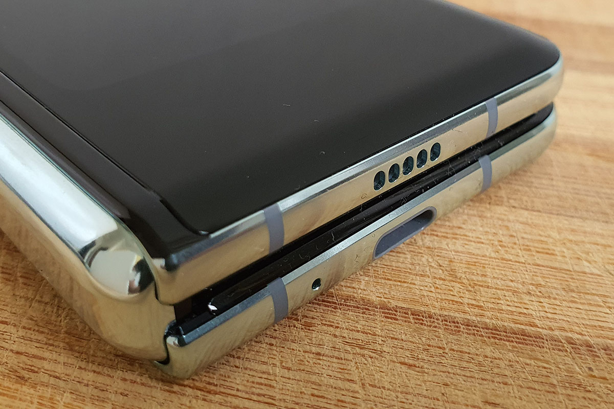 A külső panel messze nem olyan nagy, mint lehetne: 4,6 colos és minden oldalon vastag káva veszi körül. Bal oldalon a mechanika tényleg sok helyet foglal, felfelé pedig azért nem terjeszkedett tovább a Samsung, mert a 21:9-es panel már így is eleve elég nyúlánk. A kijelző felett helyezkedik el az előlapi kamera és a beszédhangszóró, a kijelző alá (oldalra) pedig a mikrofon került. Az alsó élen, de már az alsó részen helyezkedik el a töltő csatlakozója, ami azért jó, mert ha a telefon töltés közben az asztalon van, akkor úgy lehet kinyitni, hogy a kábelt nem kell kerülgetni. Szintén jó ötlet volt, hogy a gombok is az alsó részre kerültek, mert így csukott és nyitott állapotban is a jobb oldalon érjük el őket. A gombok alatt, oldalt helyezkedik el az ujjlenyomat-olvasó valamint a SIM-tálca is. Jack dugó nem fért el a telefonon, cserébe a Samsung vezeték nélküli fülest ad a mobil mellé.