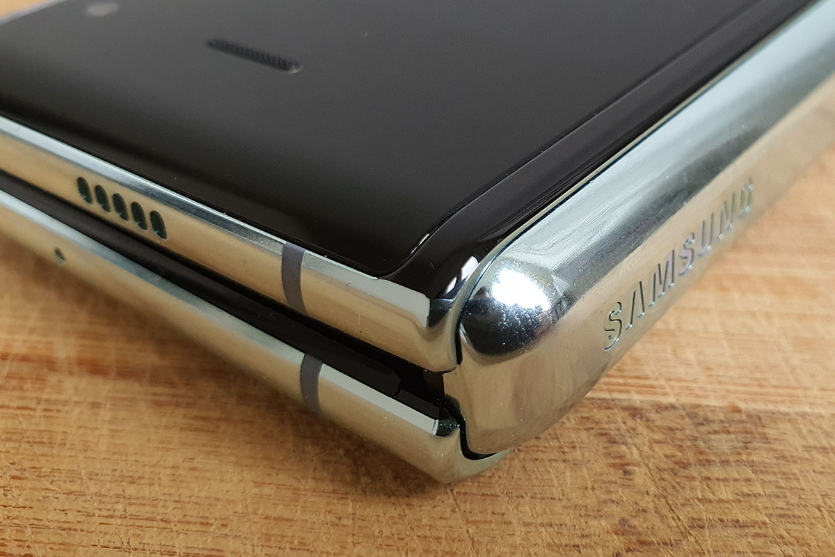 A Samsung Galaxy Fold dizájnja természetesen a kijelző körül forog. Az összehajtható mobiloknál kétféle szemlélet is adott volt: az egyik szerint a mostani telefonok méretét (többé-kevésbé) megtartva jóval nagyobb kijelzőt lehet használni, a másik szerint pedig a kijelző méretének megtartása mellett az eddigieknél jóval kisebb telefont lehet gyártani. A Galaxy Fold előbbi gondolatmenet mentén készült, de már tudjuk, hogy a Samsung következő összehajtható mobilja, a Z Flip a második elvet fogja követni. A nagy kijelző is kétféle opciót rejt: a Samsung úgy tervezte meg a Foldot, hogy összehajtáskor az OLED-panel belülre kerül. Cserébe kívül is van egy sokkal kisebb kijelző, amit nagyon sok feladatra lehet használni. Levelek elolvasásához például bőven elég ez is. Persze pikáns dolog egy batár nagy telefont összecsukva, kis kijelzővel használni.