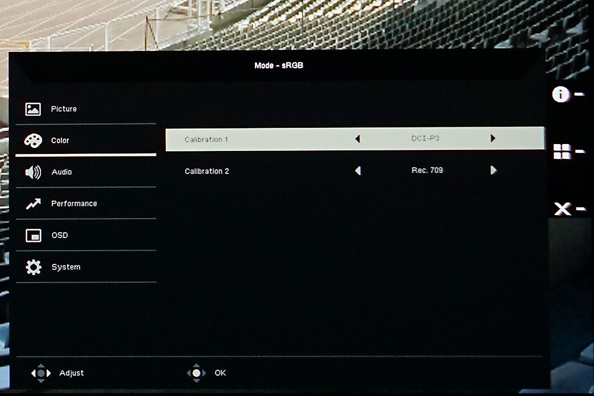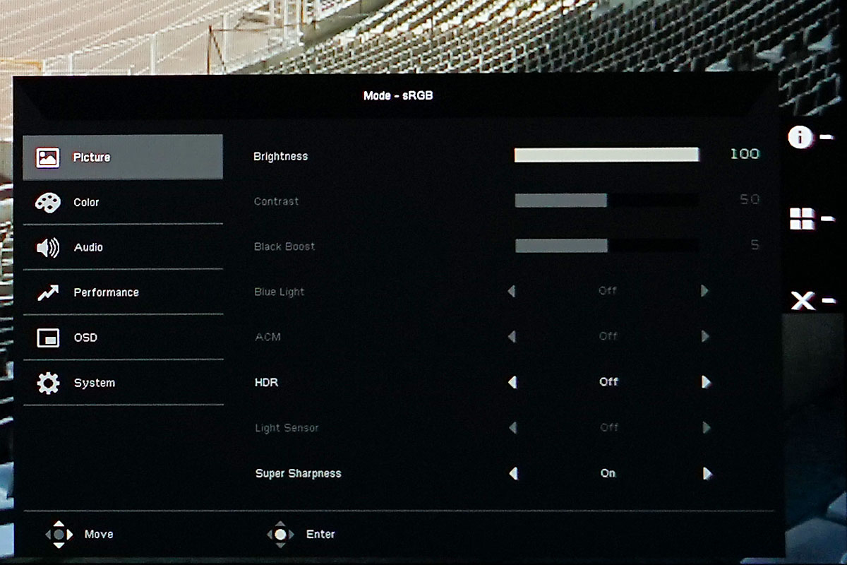 A vezérléshez egy apró joystick használható, ami némiképp eltér a megszokottól, de gyorsan lehet alkalmazkodni hozzá. A menü egy monitornál nem szokott túl bonyolult lenni, és ez alól a szabály alól az Acer CP3 sorozat sem kivétel; viszont itt is visszaköszön a Predator X27 örökség, mert a pontos kalibráció mellett lehetőség van a képjavítók kikapcsolására és akár célkereszt használatára is.