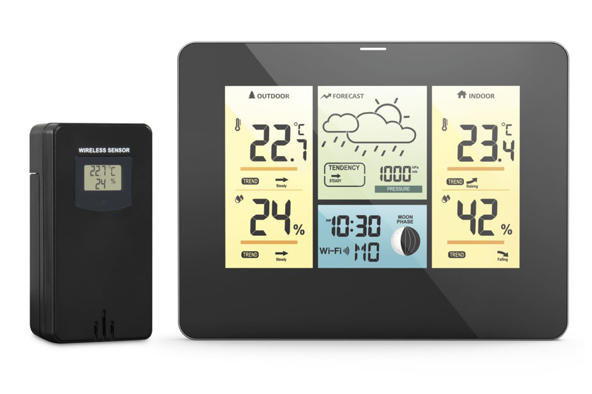 Ezt a hőmérsékleti adatot pedig – többek között – egy másik hasznos kényelmi eszköz, az okos időjárás-állomás (176596) tudja szolgáltatni például. Az időjárás-állomás egy beltéri és egy kültéri egységből áll, előbbit a szobában kell elhelyezni, utóbbi pedig mehet a kertbe vagy akár a pincébe, garázsba. Az sem baj, ha messzire kerül a központi egységtől, hiszen akár 30 méterről is tud kommunikálni vele. A beltéri egység egy nagy hatalmas kijelzőn három részre tagolva mutatja a fontos adatokat: bal és a jobb oldalon hőmérsékleti adatok és páratartalom olvasható le, középen pedig a légnyomás és az időjárás-előrejelzés, alattuk az idő, a holdfázis és a hét napja láthatók.