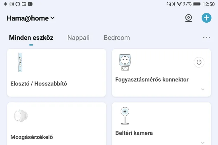 A Hama rendszeréhez hozzáadott eszközök a főképernyőn jelennek meg, kis kártyákon. Kattintás után látszanak a részletes opciók, hogy pontosan mik, az az adott eszköztől is függ. Egy okosizzó esetében például a bekapcsoló gomb alap, a színhőmérséklet és a szín viszont nem minden hardver esetén fog látszódni. A csatlakoztatott eszközöket szobákba is rendezheted – ez az opció sokat segít abban, hogy a kütyüket jobban átlásd. Az egyszerűbb kezelhetőség érdekében jeleneteket is létrehozhatsz, ami például akkor nagyon praktikus, ha több lámpa fényét egyszerre szeretnéd állítani.