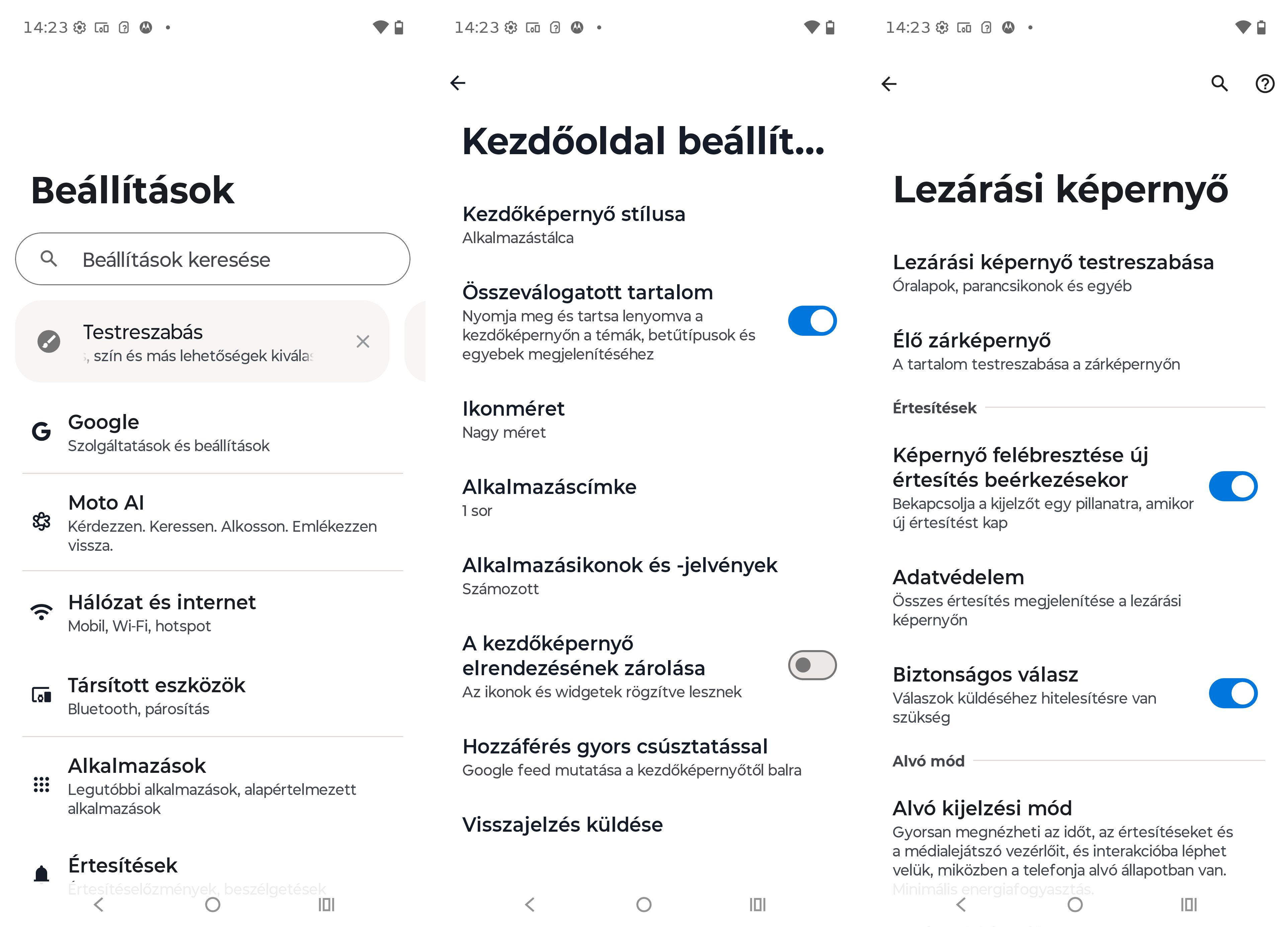 Az interfész testreszabható, de nem olyan mértékben, mint például a Samsung-féle One UI. A háromgombos menü kiváltható gesztusokkal, az értesítéseket pedig a telefon a lezáró képernyőn is meg tudja mutatni, így nem kell feloldani a mobilt csak azért, hogy megnézzünk például egy üzenetet.