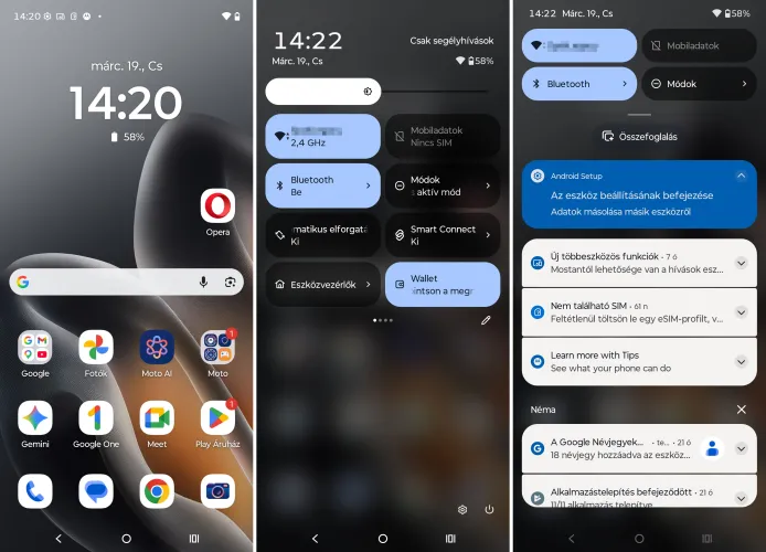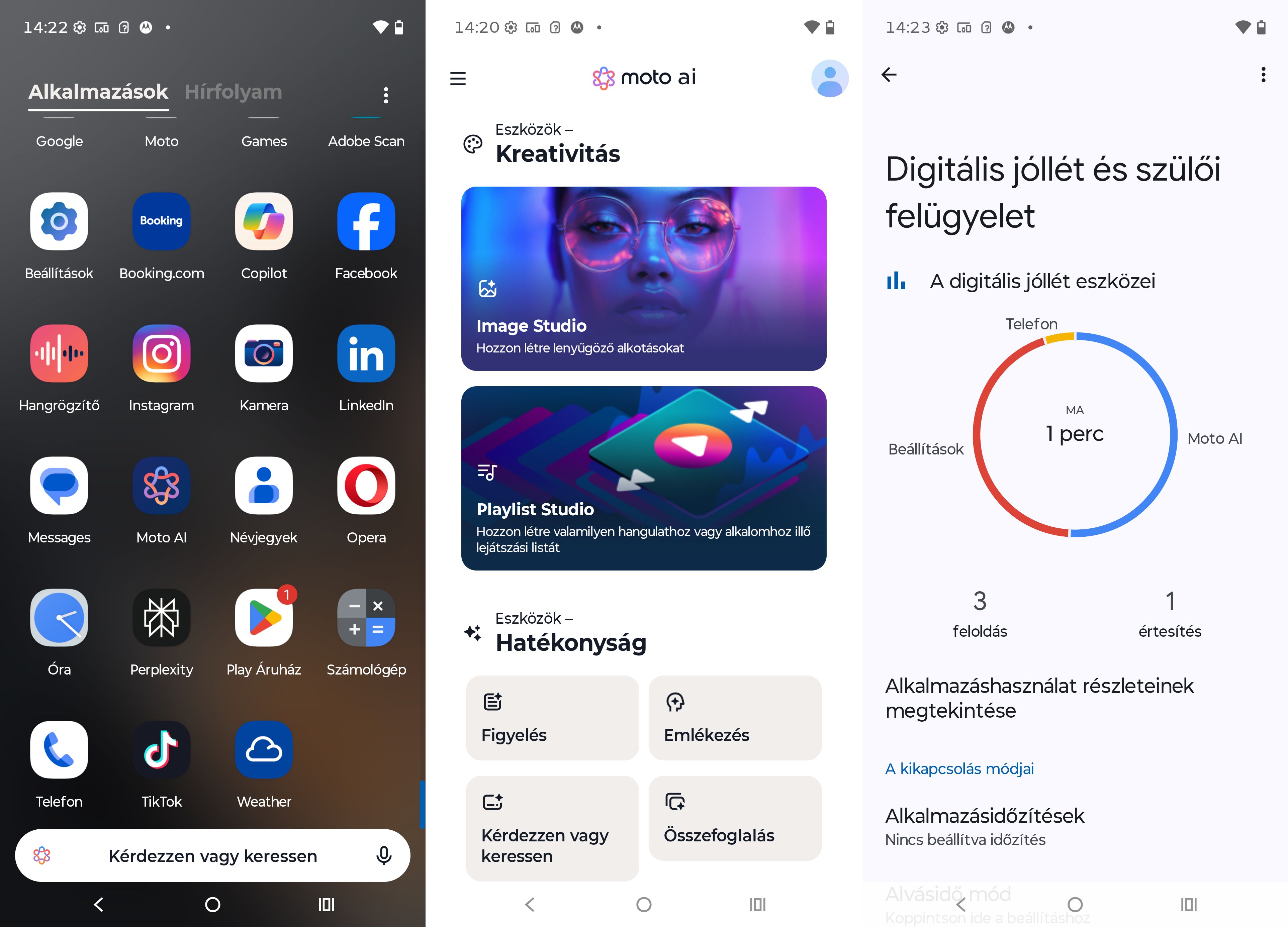 Noha dizájnban megvan a steril Android élmény, az alkalmazásválasztékba becsúszott pár (sok) bloatware is, többek között PDF-olvasó, Opera böngésző, TikTok, Perplexity és Microsoft Copilot is. Természetesen megvannak a Google saját alkalmazásai is, amelyeket néhány érdekes Motorola app egészít ki: a Moto Secure egy közös felületet ad a biztonsági funkciók számára (pl. alkalmazásengedélyek kezelése, AI védelem az adathalászok ellen), valamint lehetőséget ad arra, hogy egy biztonságos mappát hozzunk létre a személyes adatoknak, a Moto Unplugged pedig egy olyan alternatív kezelőfelület létrehozásában segít, amelyre ha átkapcsolunk, csak az általunk engedélyezett alkalmazások és értesítések működnek. Azaz arról van szó, hogy „kicsekkolhatunk” a hétköznapi forgatagból, ha szeretnénk némi minőségi időt eltölteni akár egyedül akár a családdal, barátokkal.