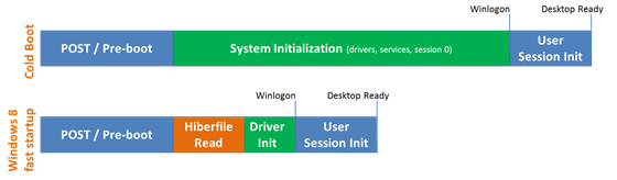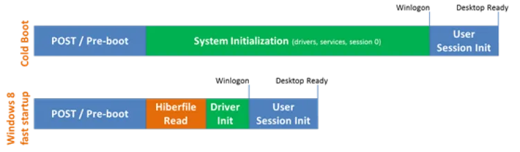 A számítógép indításakor az első hosszabb lélegzetvételű esemény a POST, amely során a BIOS feltérképezi és ellenőrzi a hardvereket. Ezt követően az operációs rendszer betölti a kernelt, az illesztőprogramokat és a rendszereszközöket, majd a felhasználók által telepített alkalmazások következnek. A folyamat egyik leghosszabb része a kernel betöltése, ezen gyorsíthat sokat a Windows 8-ban egyelőre csak „fast boot”-ként, azaz gyorsindításként szereplő opció: a Windows 8 a kernel tartalmát a RAM-ból egyszerűen kiírja a merevlemezre, azaz hibernálja, míg az alkalmazásokat a korábbi gyakorlatnak megfelelően, rendeltetésszerűen állítja le. Indításkor a folyamat ellenkező előjellel játszódik le, és ahelyett, hogy a kernel szépen fokozatosan, lépésről lépésre töltődne be, egyszerűen csak beolvasásra kerül – amivel rengeteg idő takarítható meg.