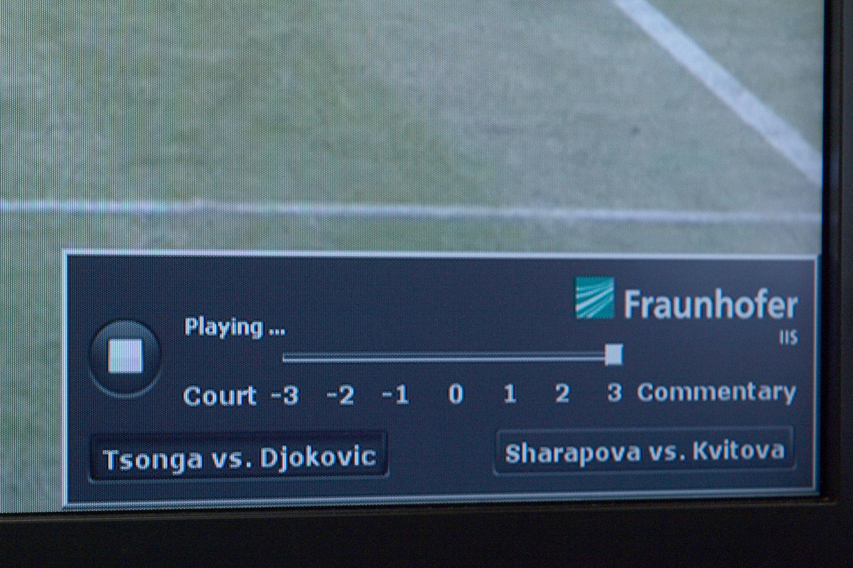A teniszes példánál maradva, ezt a két hangsávot már a jelenlegi rendszerben is rögzítik, azonban a nézőkhöz egy mix jut el, egy olyan keverék, amit az adott közvetítő optimálisnak tart. A Fraunhofer rendszerével viszont egyénileg állíthatjuk be, hogy a kommentátort tartjuk-e fontosnak, vagy azt, hogy még a fű rezzenéseit is halljuk. A trükkhöz speciális hangsáv elkészítése szükséges, amit a Fraunhofer saját fejlesztésű szoftvere képes előállítani. A stream tartalmazza a különböző hangcsatornákat és azokat a kiegészítő információkat, amelyek alapján a „másik” oldalon is teljesen szét lehet választani őket. Arra vonatkozóan nincs limit, hogy mennyi csatorna kódolható be a HE-AAC formátumú adatfolyamba, a BBC Wimbledoni teniszközvetítése során zajló kísérletnél azonban egyelőre kettőnél maradt a Fraunhofer. A kísérletezetni vágyó felhasználók egy számítógépes alkalmazást kaptak, ezzel kellett tévézni, és ez adta a beállítási lehetőségeket is. Amint a képen is látszik, az „pálya” és a „kommentátor” felé is el lehetett billenteni a mérleg nyelvét, három fokozatban. Sajnos a környezeti zajok túl hangosak voltak ahhoz, hogy érdemi felvételt készítsünk, de azt kell mondanunk, hogy a dolog remekül működik, gyakorlatilag teljesen el lehet némítani a kommentátort és a pálya mellől érkező hangokat is.