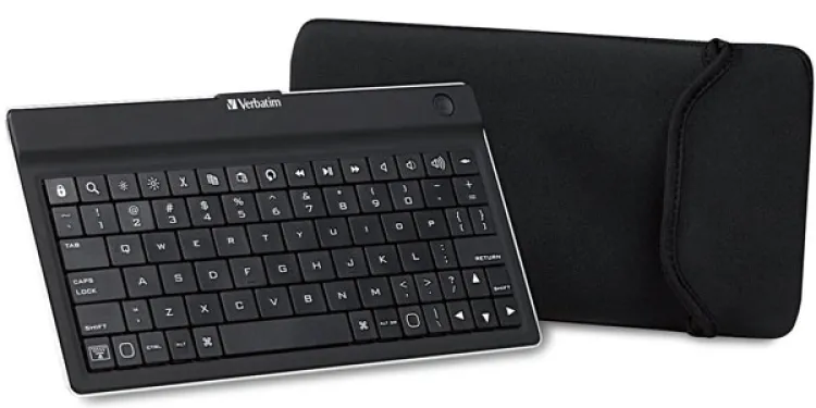 Valószínűleg ez adta az ötletet a Verbatimnak arra, hogy egy univerzális, minden táblagéppel működő billentyűzetet dobjon piacra. A fekete és fehér színben kapható bluetoothos klaviatúra az Ultra-slim Bluetooth Wireless Mobile Keyboard nevet kapta, és tényleg vékony, mindössze 5 milliméter a vastagsága. Bár a nagyon rövid leütési úttal rendelkező klaviatúrákat általánosságban nem szeretjük, azért még mindig inkább ilyenen pötyögnénk be a híreket, mint egy 10 colos érintőképernyőn. Még akkor is, ha az UsBWMK kiterjedése 22×12 centiméter, tehát a gombjai is kisebbek valamivel a megszokottnál. Numerikus rész természetesen nincsen rajta, viszont kurzormozgató nyilak és egy sor funkcióbillentyű került rá (ez utóbbit szó szerint is érthetjük). A billentyűzet saját akkumulátorral rendelkezik, ami USB-n keresztül tölthető, és jár hozzá egy hordozó tok is.