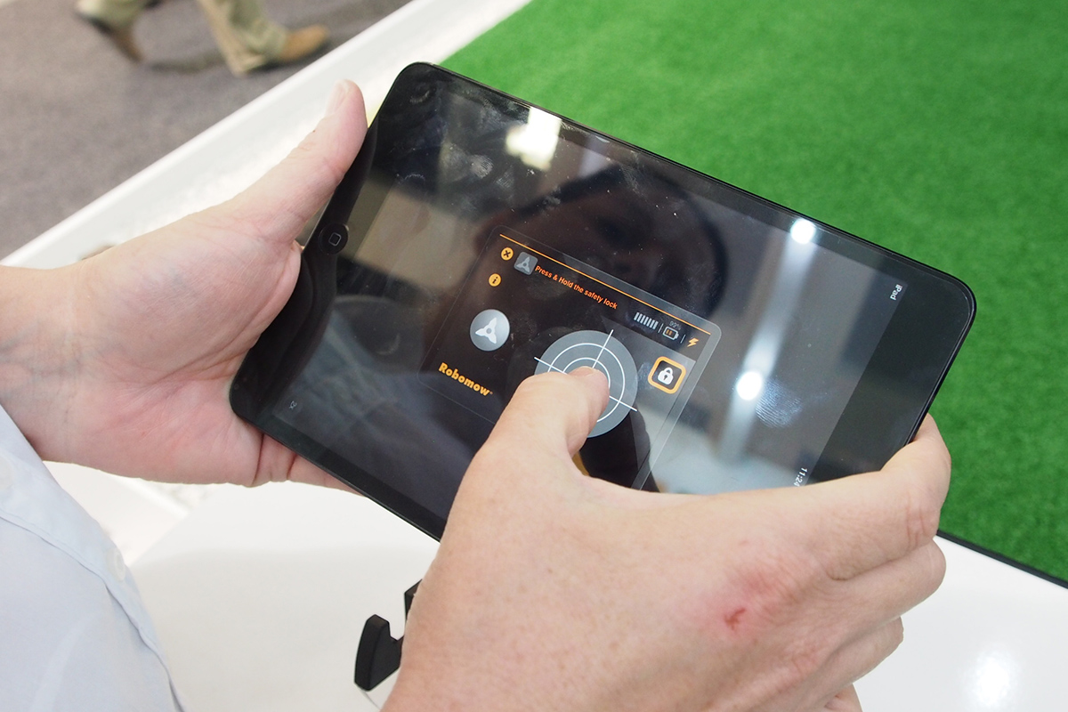 Geekek szempontjából óriási előrelépés, hogy az összes modell beépített Bluetooth adapterrel érkezik, amihez a gyártó ingyenesen letölthető mobil alkalmazásával lehet csatlakozni. A standon egy iPad minivel mutatták be a szoftver működését, de a katalógus sajnos nem részletezi, hogy Androidra és Windows-ra is elkészül-e az alkalmazás. A fekete és a zöld modelleknél az alkalmazással a robot is irányítható, míg a pirosnál a manuális irányítás nem elérhető. Az alkalmazáson keresztül minden modellnél elindítható a fűnyírás, a dokkolóba küldhető a robot és azonnal megállítható a munka, de lehetőség van a következő programozott indítás letiltására is. Természetesen mindezt csak akkor, ha a Bluetooth hatótávolságán belül vagyunk. Ha ennél nagyobb távolságból szeretnénk irányítani a robotot, akkor a GSM modulra lesz szükségünk, ami a piros modellekhez megint csak nem lesz elérhető. A GSM modul tudása és ára egyelőre nem ismert.