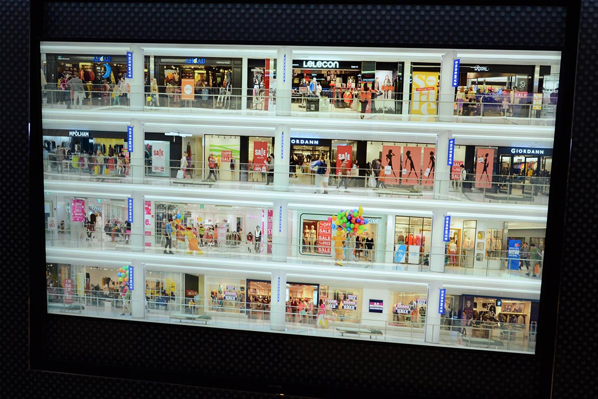A Samsung egy érdekes demót választott, egy pláza szintjeit lehet látni oldalról – a részletességet ez valóban jól bemutatja, és utal arra is, hogy a célterület elsősorban a digitális hirdetőtáblát piaca lesz, viszont nem annyira látványos a felvétel, hogy az vonzotta volna a tömegetek. Pedig, ha már valaki itt van, akkor annak kár lenne ezt a kijelzőt kihagynia.