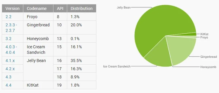 De visszatérve az Android verziókra, a Google annak mindenképpen örülhet, hogy az Android 2.3 illetve 2.2 OS részesedése még tovább csökkent, az Android 4.× verziók részesedése pedig már majdnem eléri a 80 százalékot. A leggyakoribb változat a Jelly Bean, ami persze nem túl meglepő, ha figyelembe vesszük, hogy ez a név három verziót is takar, a Google az Android 4.1, 4.2 és 4.3 változatait egyaránt ezen a néven illeti. Egyébként az Android 4.1-es változatát használják a legtöbben, a teljes állományra vetítve a felhasználók valamivel több, mint harmada (35,5%) futtatja az Android eme változatát.