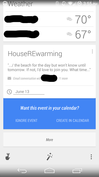 A szolgáltatás információszerzési forrásai pedig hamarosan újabb elemmel bővülnek, a Google Now ugyanis még nagyobb hozzáférést kap leveleinkhez (már ha nem tiltjuk e le tőle), és ha úgy látja, hogy egy megbeszélt találkozó nem szerepel naptárunkban, fel is ajánlja, hogy a megfelelő bejegyzést elkészíti nekünk.
