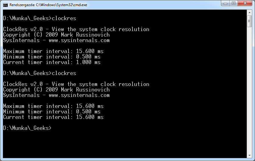 Bizonyos böngészők, így az IE csak akkor állítják gyorsabbra a tickrate-et, amikor például YouTube videókat kell lejátszani. Hogy a mi böngészőnk is él-e ezzel a kis trükkel (amitől egyébként gyorsabban reagál, legalább 14,625 milliszekundummal), azt a parancssorból futtatható Clockres programmal lehet ellenőrizni. Lehetőség szerint válasszunk olyan böngészőt a notebookra, amely nyitott ablakok nélkül nem emeli meg a tickrate-et 1 ms-ra, úgy tovább bírja majd az akkumulátor!