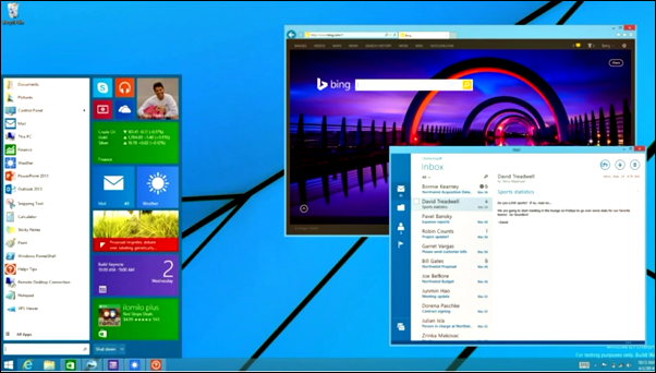 Arról is szól a fáma, hogy Start gombra semmi szükség, ennek ellenére egy friss képen továbbra is ott virít a gomb. Ez persze nem keverendő össze azzal, hogy a Start menüre sincsen szükség; ahogyan korábban már beszámoltunk róla, ez a funkció biztosan visszatér majd a Windows 9-cel. Hogy ilyen lesz, azt biztosan még nem tudni, de találgatások már vannak, például itt. Eredetileg a Microsoft már a Windows 8.1 Update 2 keretén belül szerette volna újra beépíteni az OS-be a Start menüt, de végül idő hiányában erre nem került sor. Erről valamint a Desktop felületen futtatható Modern UI-s alkalmazásokról ebben a cikkünkben már részletesen írtunk, míg a Modern UI-ban várható fejlesztésekről (pl. kibontható csempék) ebben az írásunkban számoltunk be.