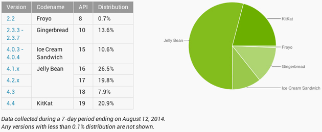 A rendszer megjelenése után nem sok gyártó vetette rá magát a KitKatre, már ami a meglévő telefonok rendszerének frissítését illeti, de ez nem túl meglepő, mert a helyzet hasonló volt a GB-ICS átálláskor is. Lassan már egy éve elérhető az Android 4.4, amelyhez idén nyáron komolyabb biztonsági frissítés is érkezett, de népszerűsége eddig nem növekedett igazán látványosan. Ma viszont már az okostelefonok 20 százalékán fut ez az OS; júniusban 14,9%, júliusban 17,9% volt a piaci részesedése. A kiugrásban nagy szerepet játszik az LG G3 és a Samsung Galaxy Tab S bemutatása, és az, hogy a nem túl régi készülékekhez azért csak érkezik egy-egy gyártói frissítés.