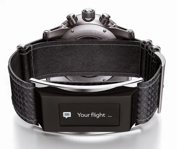 A szénszálas textúrájú bőrszíj különlegessége, hogy csuklónk alsó felén egy 0,9 colos monokróm OLED érintőképernyőt tartalmaz, a mögötte álló elektronika pedig Bluetooth adapterrel is rendelkezik azért, hogy képes legyen iOS-es vagy androidos okostelefonunkhoz csatlakozni. A funkciók listája a szokásos elemeket tartalmazza, így figyeli lépéseinket, megjeleníti a telefonos eseményeket, vezérelhetjük vele a zenelejátszót és a kamerát, stb. Mindezért cserébe a Montblanc öt napos üzemidőt ígér, ami azért nem rossz.