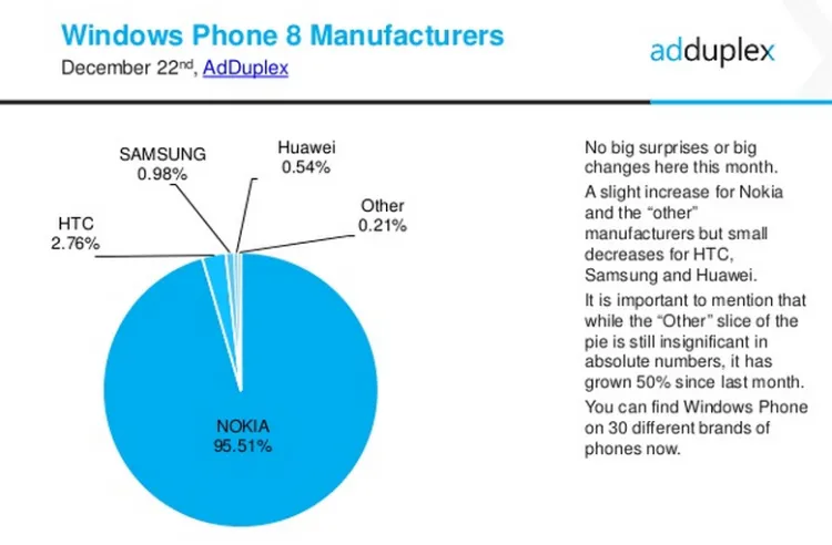 Az AdDuplex, amely hirdetési adatait felhasználva minden hónapban kiadja a Windows Phone alapú készülékekkel kapcsolatos jelentését, ezúttal a piac két jelentős változására hívta fel a figyelmet. Az egyik az, hogy a Lumia 63x sorozat tagjai a piac 11,2 százalékát szerezték méeg (WP-s részpiac), ami nagyjából 5 millió eladott készüléket jelent. A növekedés a világ minden táján érezhető, még az USA és India piacán is, amelyek egymástól jellegükben is eltérnek. A másik fontos változás az, hogy a kimutatás „egyéb” része fél év alatt 23,2 százalékról 32,8 százalékra nőtt.