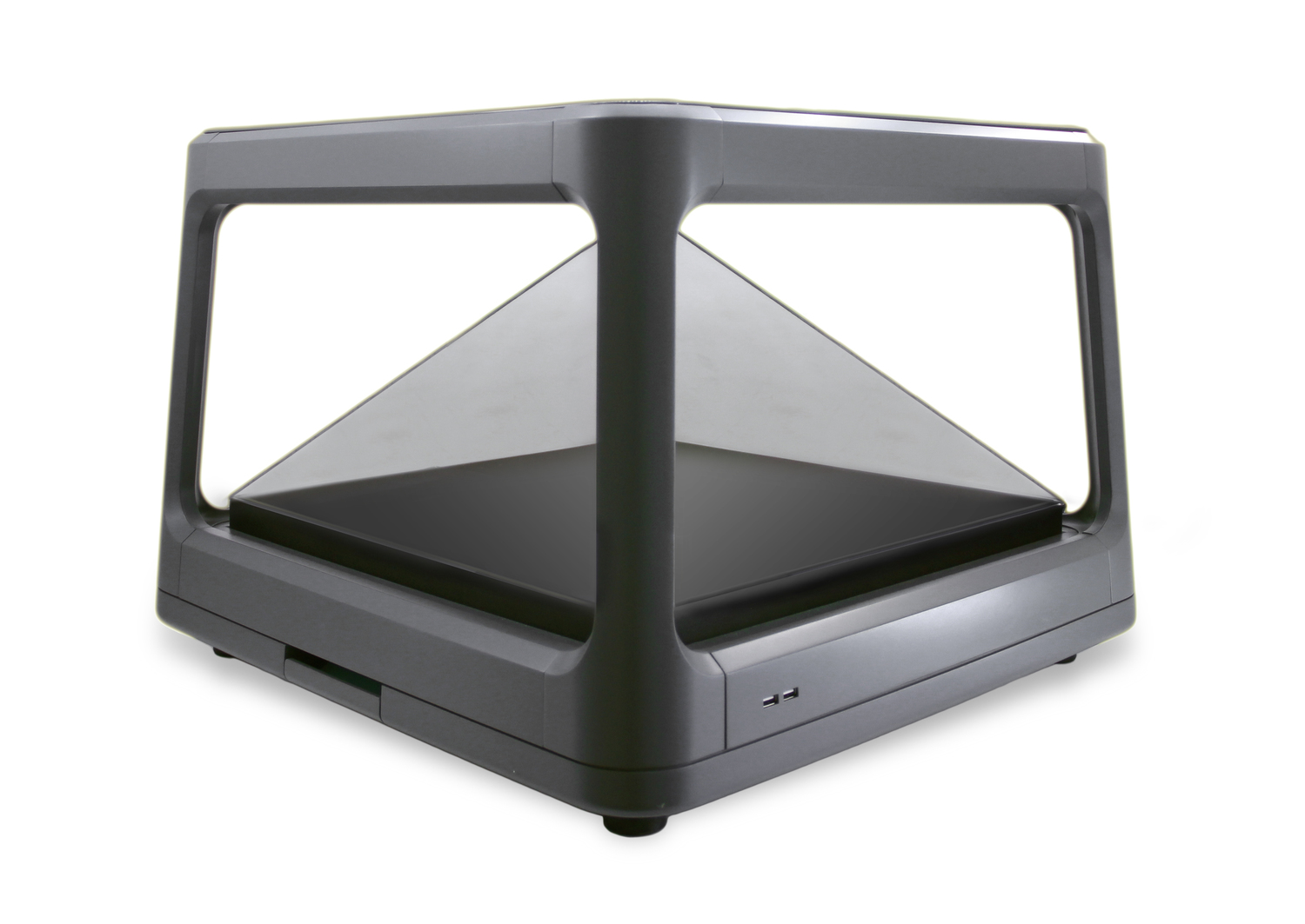De van egy apróság, ami miatt mégsem gondoljuk valós holografikus kijelzőnek: a kisebb változat, a Holus Home Edition (230 x 450 x 450 mm) bemenete egy darab USB port, oldalanként 640k képpontot jelenít meg a 405 x 405 x 191,5 mm térszelet egy-egy oldalán. Ez azt jelenti, hogy a készülék teljes felbontása 2,56 megapixel, tehát valamivel nagyobb a Full HD-nál. A nagyobb változat HDMI-n 1920x1920 felbontású képet szolgáltat. Az USB 3.0 tehát elég adatot (maximum 1600x1600 felbontást) át tud vinni, még akár meg is jelenítheti a négy oldal számára a képet. Ha a piramis teljes területét 1 milliméteres kockákra, képpontokra bontanánk, akkor 7,8 megapixel kellene – a képek alapján viszont ennél nagyobb felbontást tud. Több filmben feltűnik, hogy ha egy másik oldalt is nézünk, a kép azon átlátszó, nem jelenik meg rajta semmi. Más filmeken viszont igen, de ahhoz képest pedig a felbontás túl jó. A piramis oldalai tehát valószínűleg inkább csak egyfajta tükörként funkcionálnak.