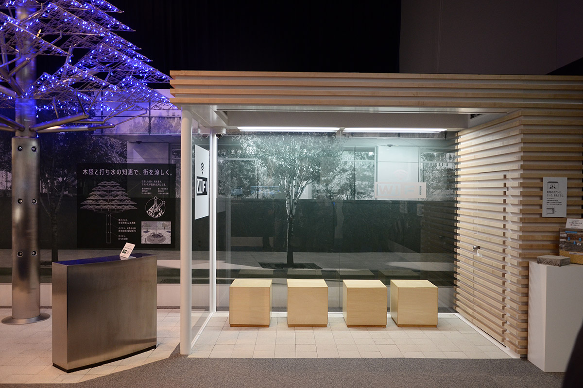 Az olimpiára ideérkező, a hőséget nehezen tűrő látogatókat több hűsítő megoldás is várja majd: ez a mesterséges, és szépnek egyáltalán nem nevezhető fa például árnyékol, és párologtatott vízzel hűt, a buszmegállóhoz hasonló bódéban pedig napelemmel „meghajtott” légkondi működik.