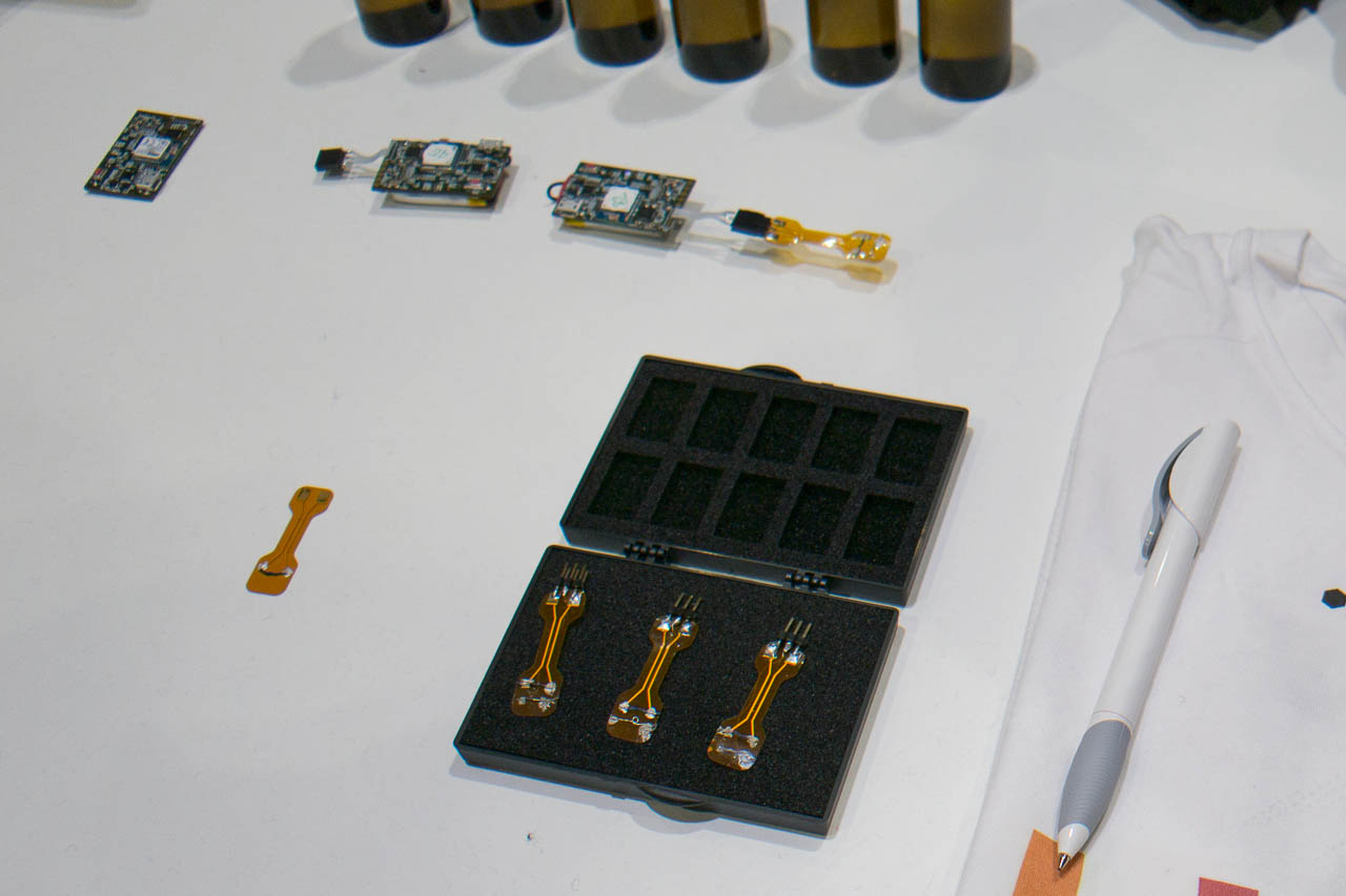 A ruhába épített különböző eszközök gyenge pontja mindig az, hogy az alkatrészeket a szövethez a lehető legjobban hasonlító anyagból kell készíteni. A HTF standján kiállított apró érzékelő „lelke”, azaz a jelek előállítására képes rész maga is apró szálakból áll, ami azért lehet hasznos, mert így például cérnaként is viselkedhet az anyagban, a ruha szerves részét képezve.