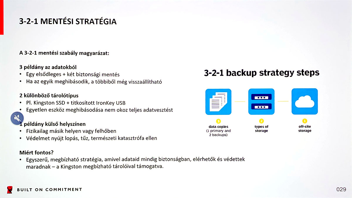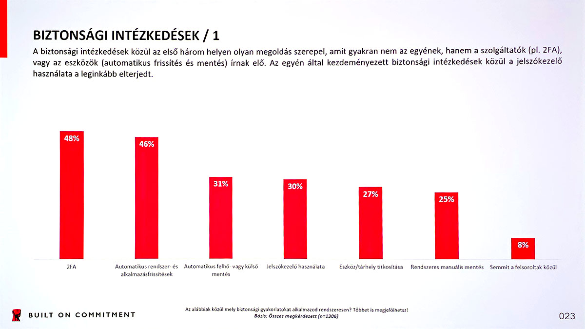 A felmérés legfontosabb megállapítása az volt, hogy a magyar lakosság nagyobb része egy esetleges adatvesztés esetén teljesen kiszolgáltatott helyzetbe kerül, hiszen a válaszadók több, mint fele, 58 százalék nyilatkozta azt, hogy soha vagy legfeljebb néhány havonta készít biztonsági mentést a fontos adatokról. Nagy problémát jelent ugyanakkor az is, hogy aki készít biztonsági mentést az adatokról, jellemzően nem megfelelő módon teszi azt. A 3-2-1-es szabályt (három másolat két különböző adathordozón, amiből egy fizikailag más helyszínen található) figyelmen kívül hagyva sokan hamis illúzióba ringatják magukat, holott csak bizonyos típusú veszélyek ellen védik be magukat. A (közel) teljes biztonságot jelentő felhő alapú és helyi biztonsági mentést csak a felhasználók 34 százaléka használja, a többiek csak a felhőbe (17%) vagy csak helyi adathordozóra (49%) mentenek. Előbbi internetfüggő, ezért nem lehet teljes értékű, utóbbi pedig egy zsarolóvírus támadás, betörés vagy hardvermeghibásodás esetén semmiféle védelmet nem ad.