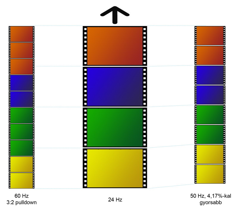 Európában és Magyarországon a PAL tévészabvány terjedt el, ami 50 Hz-es képfrissítést használ. Ez viszonylag könnyen előállítható 24 fps-es forrásból: „csupán” arra van szükség, hogy 4,17%-kal felgyorsítsuk a képet és a hangot, valamint megkettőzzük a képkockák számát. Természetesen így rövidebbek lesznek a filmek (a moziban 100 perces film a tévében vagy DVD-n csupán 96 percig tart), de a gyorsulást szemmel lehetetlen érzékelni. A hang már kicsit problémásabb, mert a megnövelt tempó miatt majdnem fél hanggal magasabbra kerül minden – ez főleg az erősebb basszusok esetében „káros”, de megváltozik valamelyest a térhatás is. A változás persze annál inkább érzékelhető, minél komolyabb audio rendszert használunk.