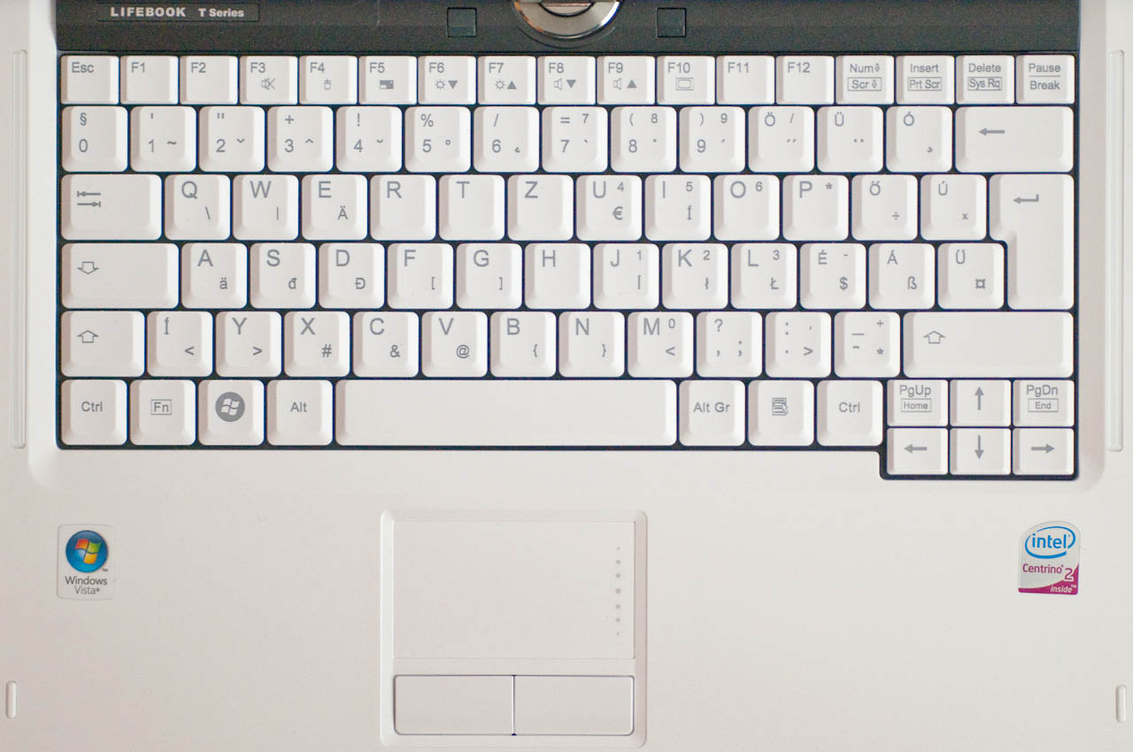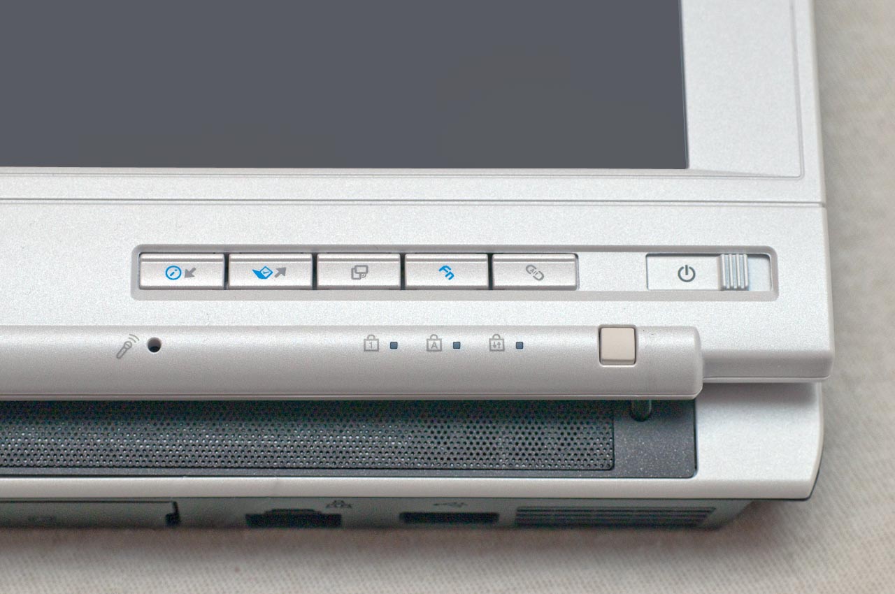 Egy táblaPC-n a notebookokhoz képest mindig sokkal több plusz gomb van, hogy könnyebb legyen a billentyűzet nélkül is kezelni – így nem csodálkoztatunk azon, hogy a kijelző kávájára is egész gombrengeteg került. Szemből nézve rögtön láthatjuk a kijelző jobb alsó széle alá került öt gombot (a hatodik az elcsúsztatható Power-gomb). Ezekkel többek között le- és felfelé görgethetünk a dokumentumokban, válthatunk a fekvő és álló képernyőmód között, elindíthatjuk a Fujitsu-Siemens saját alkalmazásait és így tovább. A zsanér másik oldalán egy vékony érintésérzékeny csík található, amivel scrollozhatunk az oldalakon – mindezen kezelőszervek elhelyezése olyan, hogy ha írótáblaként magunk előtt tarjuk a gépet, kényelmesen elérjük őket ujjainkkal. Kijelzője egyébként nemcsak a bal oldalból kihúzható tollal kezelhető, hanem ujjunkkal is.
