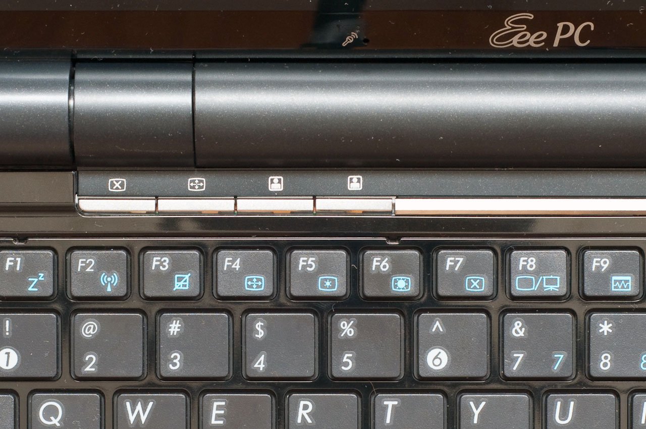 A különböző funkciók, mint például a hangszóró némítása, a vezeték nélküli adapterek ki/bekapcsolása vagy az alvó üzemmód aktiválása a felső gombsor+Fn gomb megnyomásával hívhatóak elő, de a bekapcsoló gomb vonalát folytató krómcsíkban négy külön gombot is találunk. A bal szélsővel a kijelzőt kapcsolhatjuk ki, a következővel pedig a képernyő felbontását állíthatjuk be (1024x600, 1024x768 görgetéssel illetve 800x600 között válthatunk). A két jobb oldali gomb funkcióját a felhasználó saját ízlése szerint konfigurálhatja, alapbeállítás szerint az egyikkel a energiatakarékossági beállításokért felelős Eee Super Hybrid Engine üzemmódjai között válthatunk, a másikkal a Skype-ot indíthatjuk el.