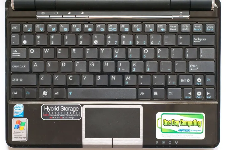 Az átdolgozott kiosztású és kivitelű billentyűzet jobban sikerült, mint sok eddigi Eee PC esetében, így végre normálisan gépelhetünk rajta. Ez persze a 10”-es kijelző nyújtotta nagyobb felületnek is köszönhető, de annak is, hogy a jobb oldali Shift végre a helyére került, valamint mindkét oldalra raktak egy Fn gombot. Az 1000HE tapipadja hagyományos, „alsógombos” megoldású, viszonylag kis felületű, viszont multitouchos. Gombjai viszont egy egészen picit talán nehezen megnyomhatók.