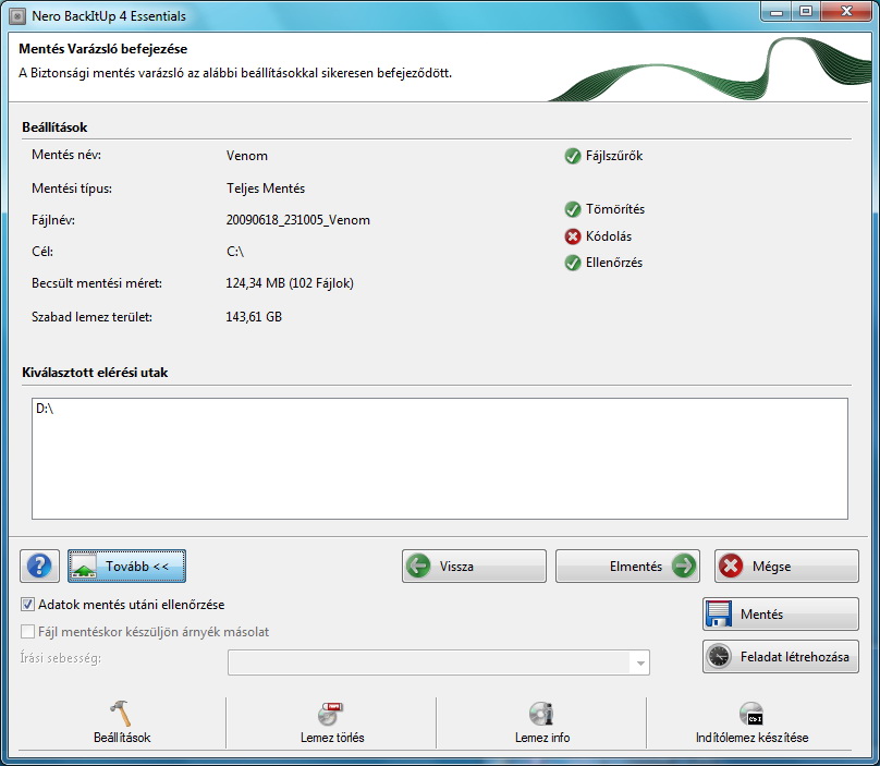 A Nero BackItUp a teljes, a frissítő, a növekményes és a különbözeti mentési módokat is ismeri – ezek közül mindenki kiválaszthatja a számára legjobban megfelelőt. A program annyi extrára képes, hogy kérésre a fájlokat tömöríti (ZIP-be). A mentések feladat alapúak, amelyek konfigurálása a varázslónak köszönhetően nem túl bonyolult, bár a magyar fordítás egy-két helyen kicsit sántít. Mentés mappákról/fájlokról illetve, ha rendszergazdai jogosultsággal indítottuk a programot, akkor HDD-ről, partícióról tudunk. Előbbi esetben a fájlok szűrésére is van mód.