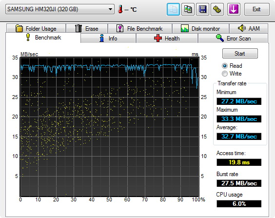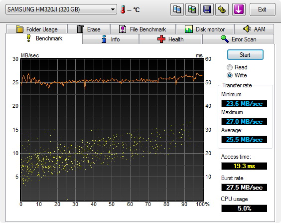 A HDD egyébként 5400 rpm-es és 8 Mbájt cache-t tartalmaz, ami bőven elég, lévén, hogy mindenképpen az USB sávszélessége lesz a szűk keresztmetszet. Olvasásnál 32,7, írásnál 25,5 MB/s-os tempót mértünk, ami teljesen átlagos. Az elérési idő igazából nem számít, legfeljebb akkor, ha nagyon sok apró fájlt másolunk; ez az adat 19,8 ms. Azt feltételezve, hogy a meghajtón nagy fájlokat tárolunk, a teljes tartalom 155 perc alatt olvasható be illetve kb. három óra alatt írható fel. Kisebb fájlokkal ezek az időtartalom nőhetnek.