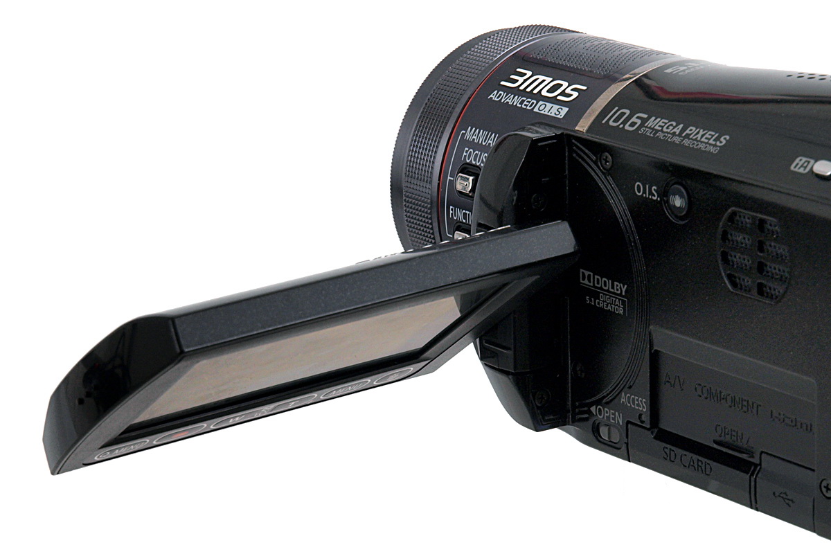 A kihajtható LCD 2,7 colos, 16:9-es és 230 ezer képpontot tartalmaz. Kihajtásával és behajtásával a kamera automatikusan be- illetve kikapcsol, ezzel is értékes akkumulátorkapacitást megtakarítva. Ha behajtjuk, akkor a belső keresőt a nézőke kihúzásával aktiválhatjuk. A kamera bekapcsolása elég gyors, csupán 2 másodpercet vesz igénybe - legfeljebb ennyi idő kell tehát ahhoz, hogy elindíthassuk a felvételt.