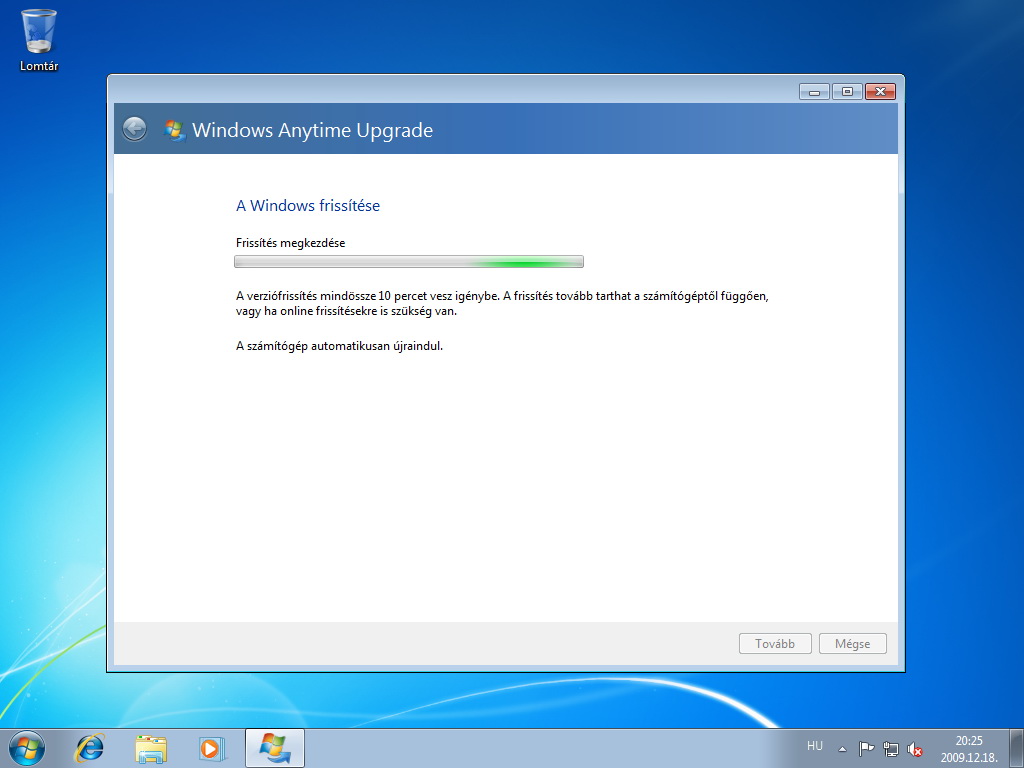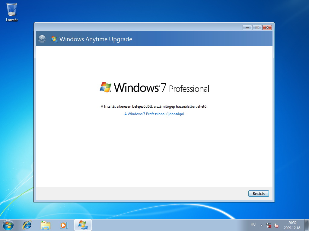 Az első indítás alkalmával a Windows Anytime Upgrade fogad minket, tájékoztat a frissítés sikerességéről.